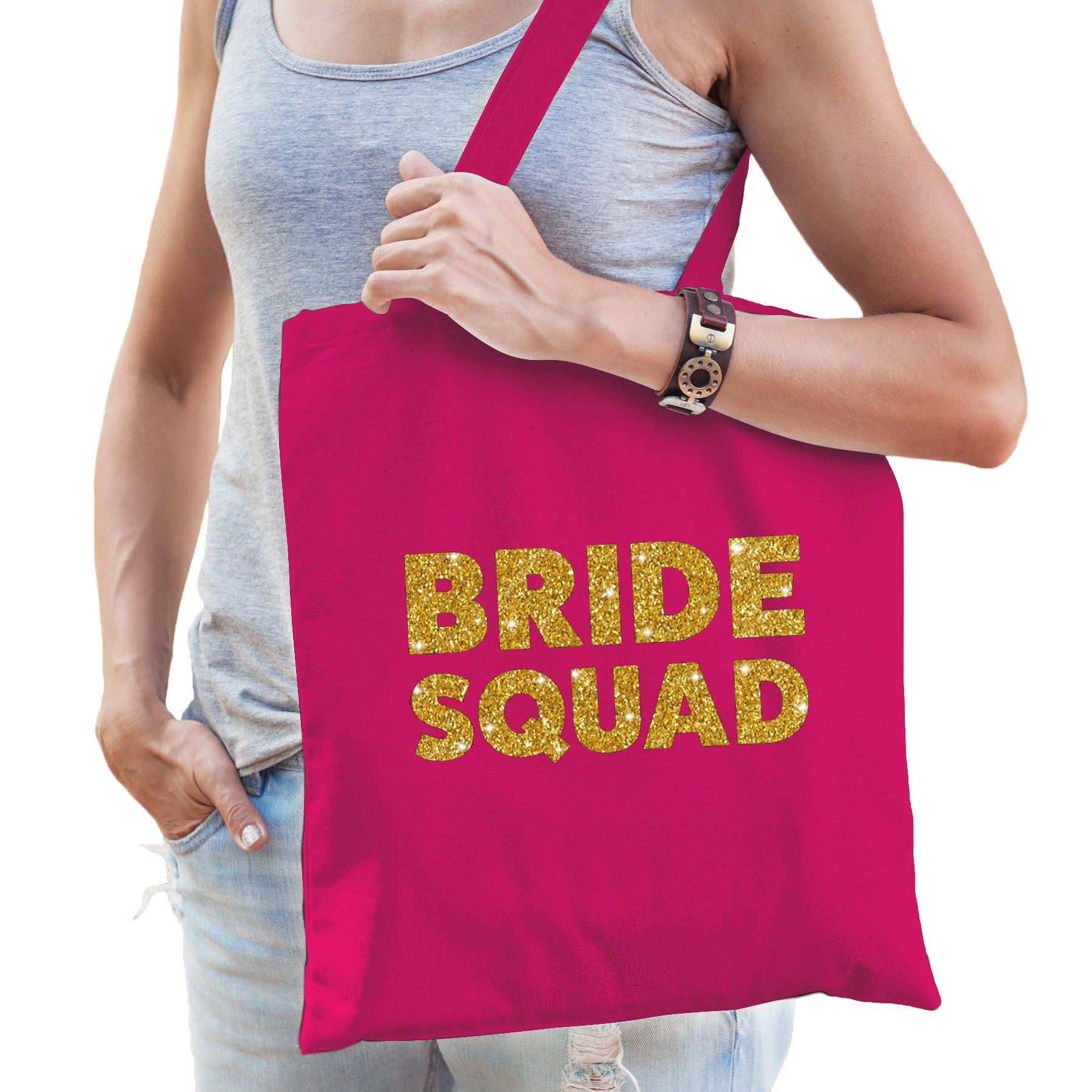 1x Bride To Be vrijgezellenfeest tasje roze goud/ goodiebag dames. Leuk tasje voor de aanstaande bruid op een vrijgezellenfeest vrouw, als accessoires of als goodiebag. Dit tasje is bedrukt met Bride To Be in dikke letters.