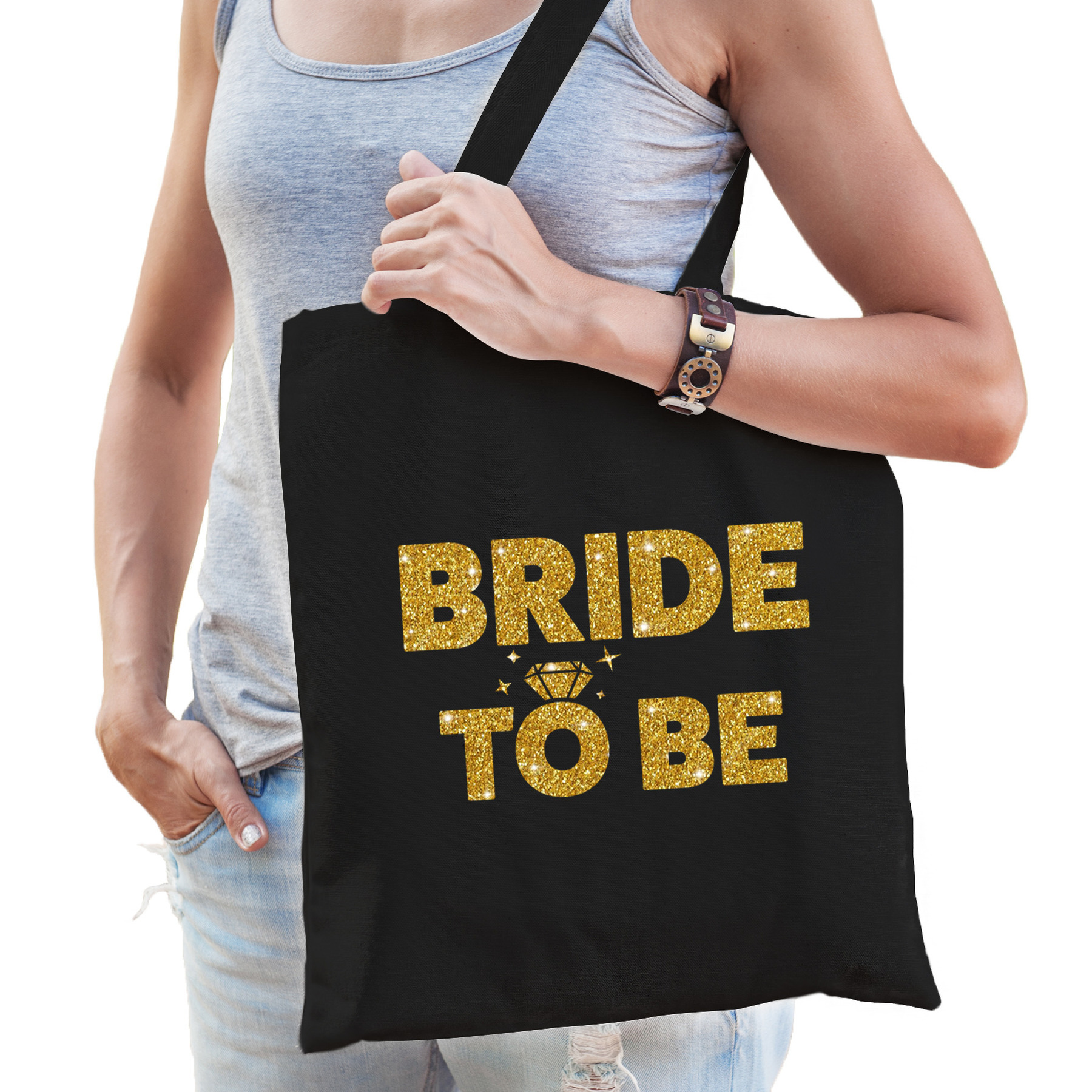 1x Bride To Be vrijgezellenfeest tasje zwart goud/ goodiebag dames. Leuk tasje voor de aanstaande bruid op een vrijgezellenfeest vrouw, als accessoires of als goodiebag. Dit tasje is bedrukt met Bride To Be in dikke letters.