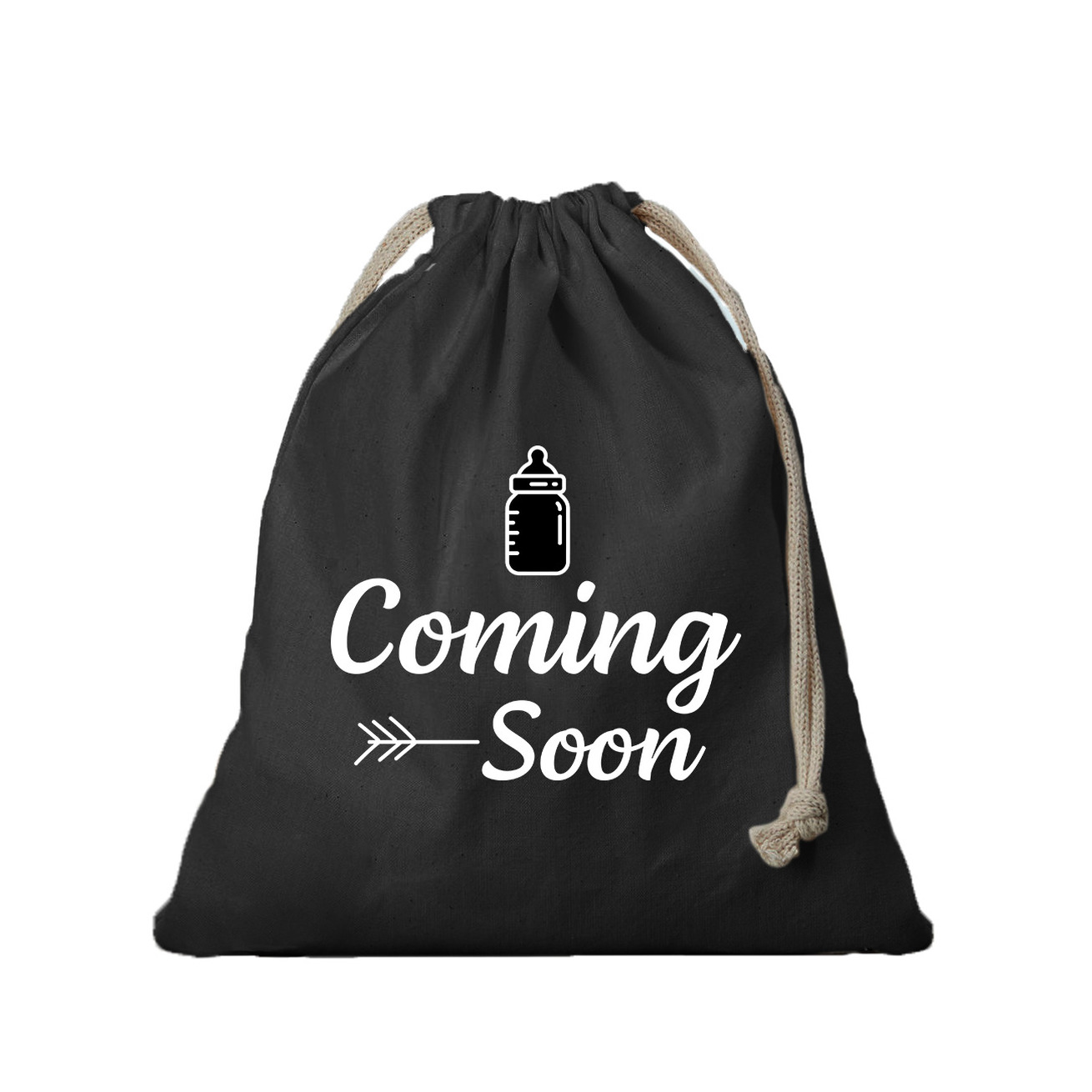 1x Canvas cadeautasjes Coming soon zwart met koord 25 x 30 cm. Geschenk/ cadeautasjes Coming soon om een cadeau in te verpakken voor bijvoorbeeld een aankondiging zwangerschap, een kraamcadeau of babyshower. Zwart canvas zakje bedrukt met een zuigflesje en de tekst: Coming soon. Formaat: ca. 25 x 30 cm.
