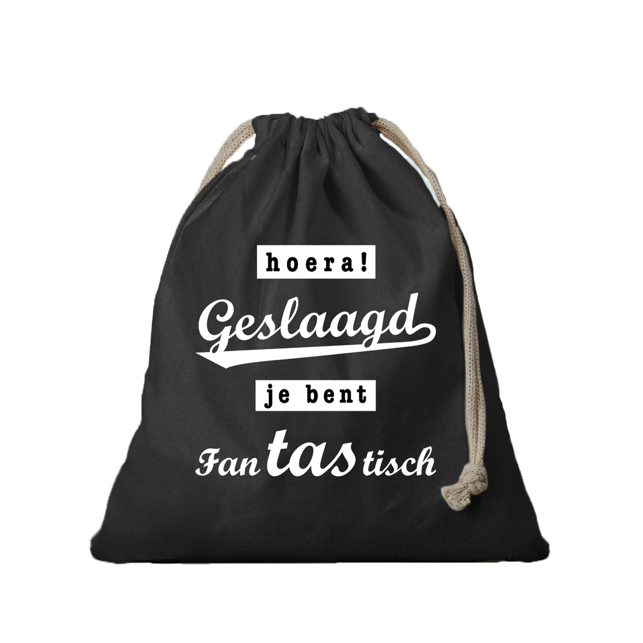1x Canvas cadeautasjes hoera geslaagd zwart met koord 25 x 30 cm. Geschenk/ cadeautasjes hoera geslaagd om een cadeau in te verpakken voor iemand die afgestudeerd of geslaagd is voor bijvoorbeeld school or een rijexamen. Zwart canvas zakje bedrukt met de tekst: Hoera! Geslaagd je bent fantastisch. Formaat: ca. 25 x 30 cm.