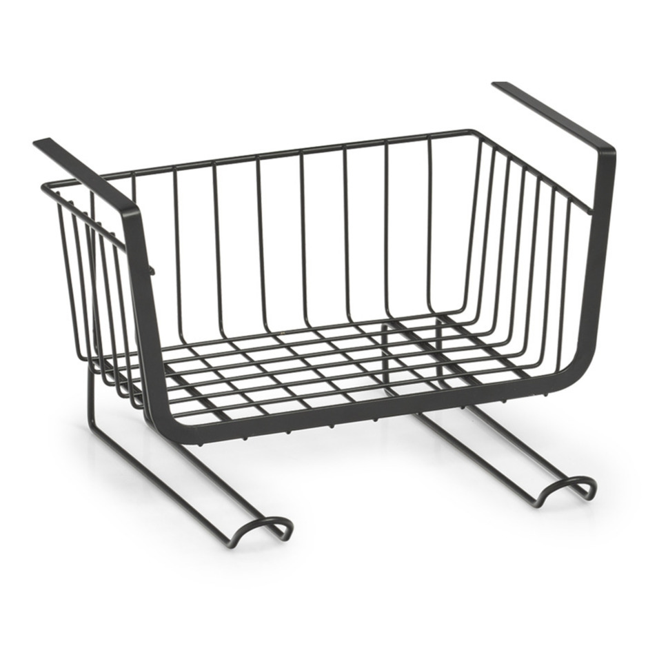 1x Zwart opberg/opruim mandje, om aan een plank in bijvoorbeeld uw kledingkast, voorraadkast of keukenkast te hangen. In het mandje kunt u o.a. voorraden sauzen of stofzuigzakken bewaren of uw sokken in opruimen. Aan de 2 haken kunt u o.a. kopjes of tassen/riemen ophangen.