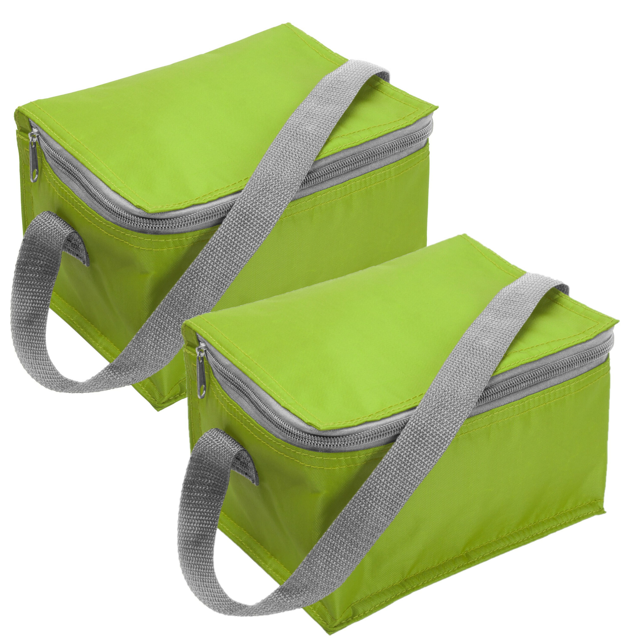 2 stuks kleine koeltas in de kleur lime groen voor 6 blikjes met ritssluiting en handige draagband. Formaat is ongeveer 20 x 13 x 13 cm. Materiaal: polyester. Koel je drankjes, lunch of medicijnen.