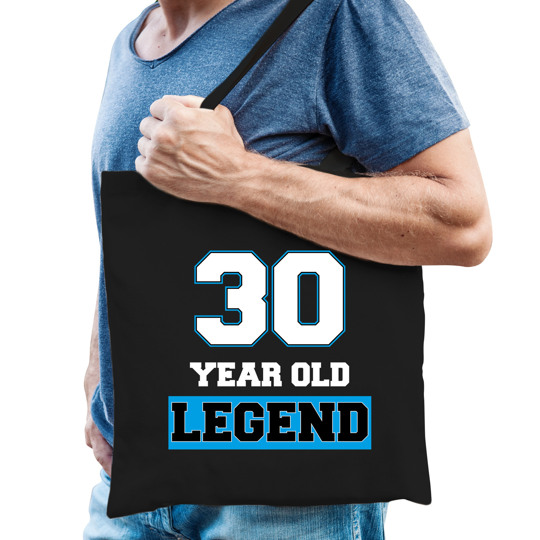 30 year old legend verjaardag cadeau katoenen tas zwart voor volwassenen. Dit zwarte katoenen tasje is eenzijdig bedrukt met de tekst: 30 year old legend. Het cadeau tasje is leuk om cadeau te geven voor iemand zijn 30e verjaardag. Ook leuk om er bijvoorbeeld cadeaus in te doen en die aan de jarige te geven! Formaat vak: 42 x 38 cm. Totale lengte inclusief hengsel: 67 cm. Materiaal: 100% katoen, 130 grams kwaliteit. Inhoud: 10 liter.
