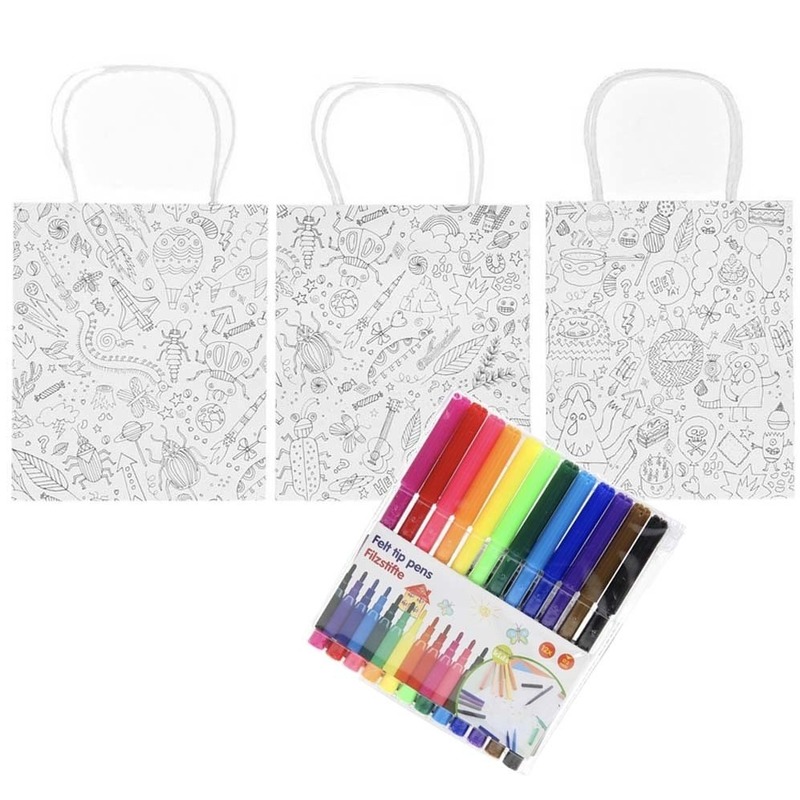 Een pak met 3 papieren tassen/tasjes (250 grams), om zelf in te kleuren inclusief 12 kleur stiften. De tasjes hebben opdrukken van o.a. insecten, aliens en vliegtuigen. De afbeeldingen varieren van 1 tot 5 cm. Afmeting tas: 18 x 21 cm. Leuk om kinderen mee te laten knutselen op een kinderfeestje/verjaardagspartijtje! Hobbymateriaal/knutselmateriaal diy tassen/tasjes kleuren voor kinderen/jongens/meisjes. De 12 gekleurde viltstiften hebben een dunne punt. De stiften worden geleverd in een etui. Hoogte stift: ca. 15 cm. Eventuele stiftvlekken zijn te verwijderen bij 40 graden wassen. , Dit artikel bestaat uit:, 1x Viltstiften – 12x – gekleurd – in etui – stiften, 1x 3x Knutsel papieren tassen/tasjes om in te kleuren – voor kinderen