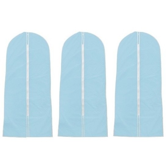 3x Lichtblauwe kledinghoezen 137 x 60 cm met rits. Lichtblauwe beschermhoes om uw kleding netjes te houden of op een nette manier te vervoeren. Afmeting: ca. 137 x 60 cm. Materiaal: zacht PEVA materiaal. Kledinghoezen/beschermhoezen kleding opbergen accessoires.