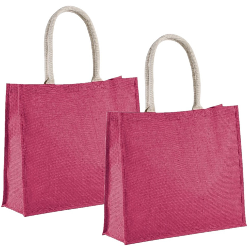 3x stuks jute fuchsia roze boodschappentassen met katoenen hengsel. Fuchsia roze boodschappentassen van jute materiaal met hengsels van katoen en een klittenbandsluiting. Afmeting ongeveer: 42 x 36 x 15 cm. Inhoud: 22 liter. Boodschappentassen van jute/katoen in de kleur fuchsia roze.