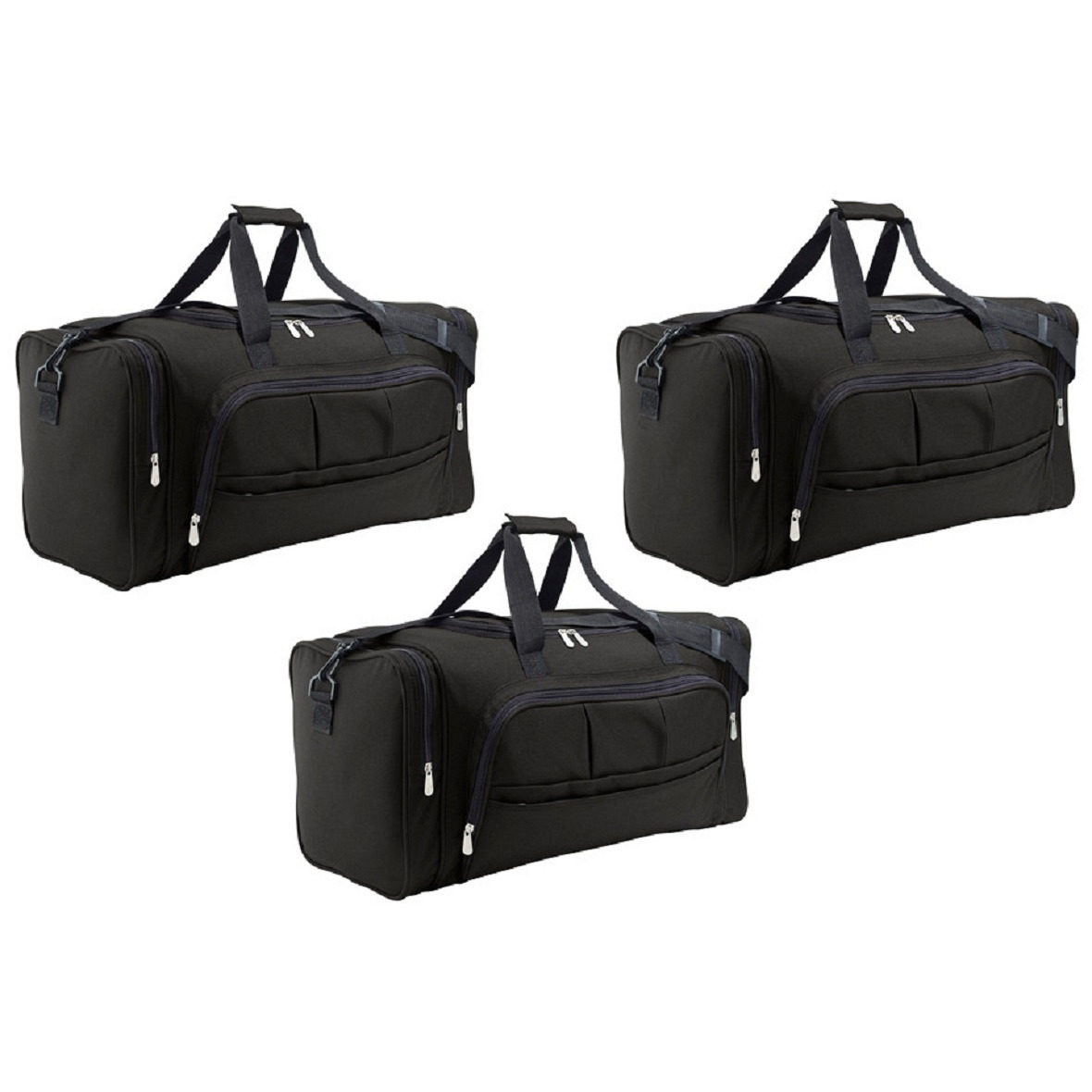 3x stuks weekendtas/reistas zwart 62 cm. Multifunctionele reistas met een groot middenvlak met rits, 2 zijvakken met rits, verstelbare en verwijderbare nylon schouderriem, nylon draagriemen met comfortabele grip en een groot ritsvak aan de zijde. Het materiaal is 600D polyester met een volume inhoud van 48,4 liter. Afmeting: 62 x 30 x 26 cm.
