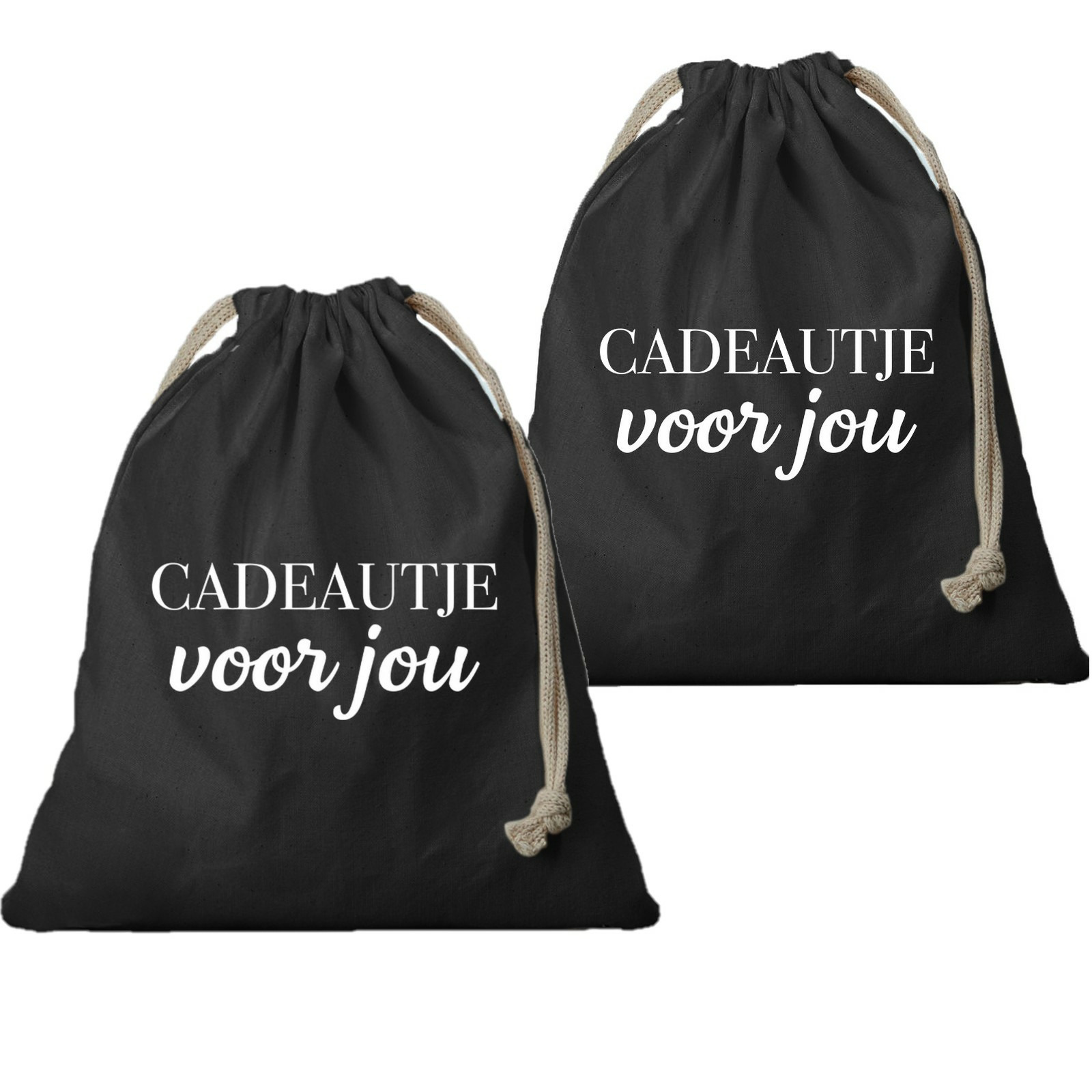 4x Canvas cadeautasjes met de tekst Cadeautje voor jou erop in het zwart met koord 25 x 30 cm. Geschenk/ cadeautasjes Cadeautje voor jou om een cadeau in te verpakken ter gelegenheid van een verjaardag, jubileum of gewoon zomaar voor bijvoorbeeld je partner, collega of een familielid. Zwart canvas zakje bedrukt met de tekst: Cadeautje voor jou. Formaat: ca. 25 x 30 cm. Materiaal: 100% katoen, 140 grams kwaliteit.