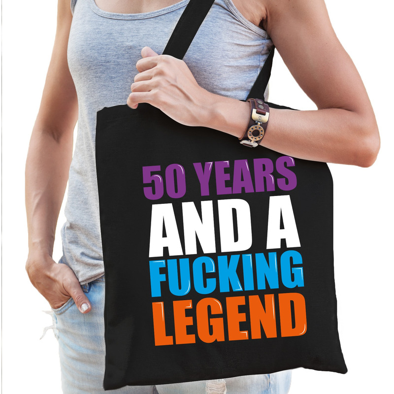 50 years legend – 50 jaar legende kado katoenen tas zwart voor dames. Dit zwart katoenen tasje is eenzijdig bedrukt met de tekst: 50 year legend / 50 jaar legende. Ken jij iemand die binnenkort 50 (vijftig) jaar wordt? En wil je hem verassen met een fantastische fun tekst tas?