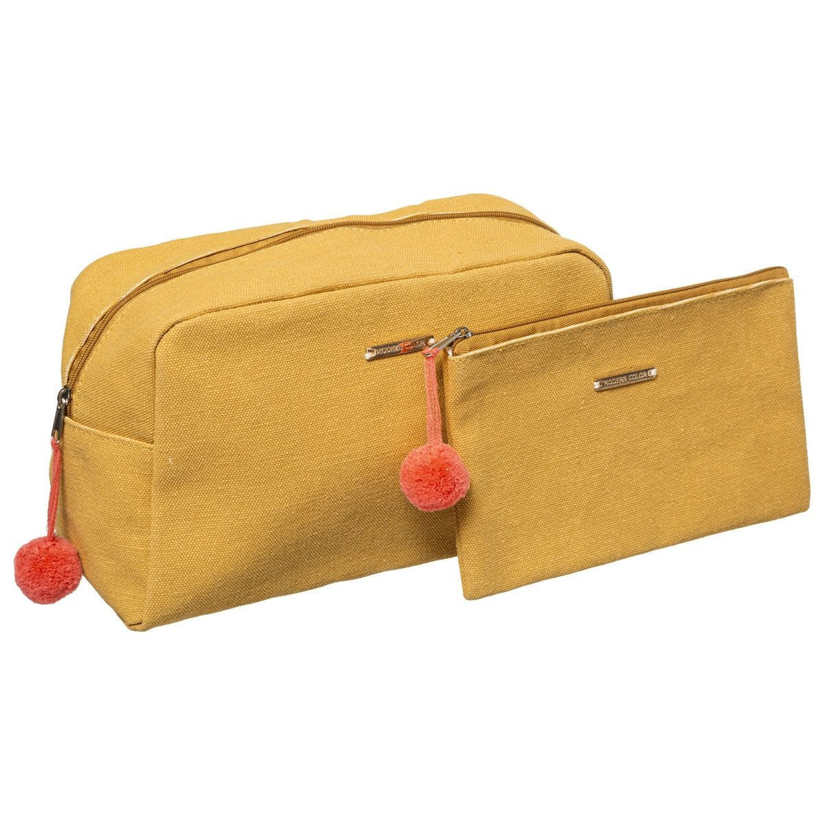 Set van 2x toilettassen/make-up/opberg tasjes geel. Twee keer zo handig, twee keer zo stijlvol! Deze geele toilettasjes van 5Five zijn jouw perfecte reismaatjes voor make-up, verzorgingsproducten of kleine spulletjes. Of je nu op vakantie gaat of gewoon je tas geordend wilt houden: met deze set van twee heb je altijd een tasje bij de hand. Het compacte formaat past makkelijk in je koffer of handtas. Reis toilettas met pompom versiering aan de ritssluiting. Formaat tas groot: ca. 26 x 11 x 14 cm. Formaat tas klein: ca. 20 x 12 cm. Materiaal: polyester/katoen.