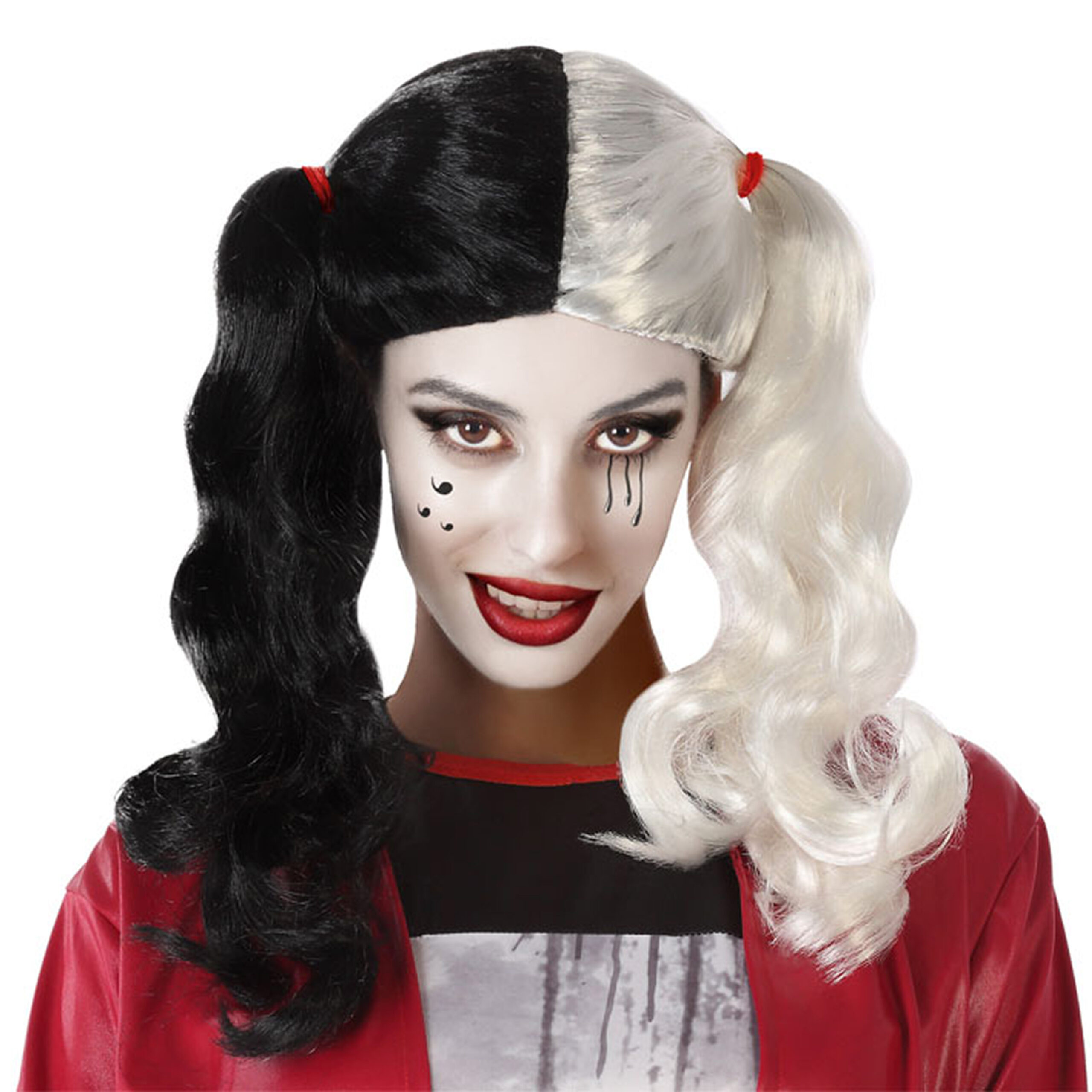 Halloween thema verkleedpruik voor dames met lang haar en staartjes in de kleuren zwart/wit. Lange dames pruik als toevoeging op uw verkleedkleding kostuum of jurk. Vergeet vooral ook de verkleed accessoires niet zoals sieraden, hoedjes, diadeems en tassen. Geschikt voor de horror verkleed thema’s zoals: Heksen, Vampier, Zombie, Spoken, dark lady/queen.