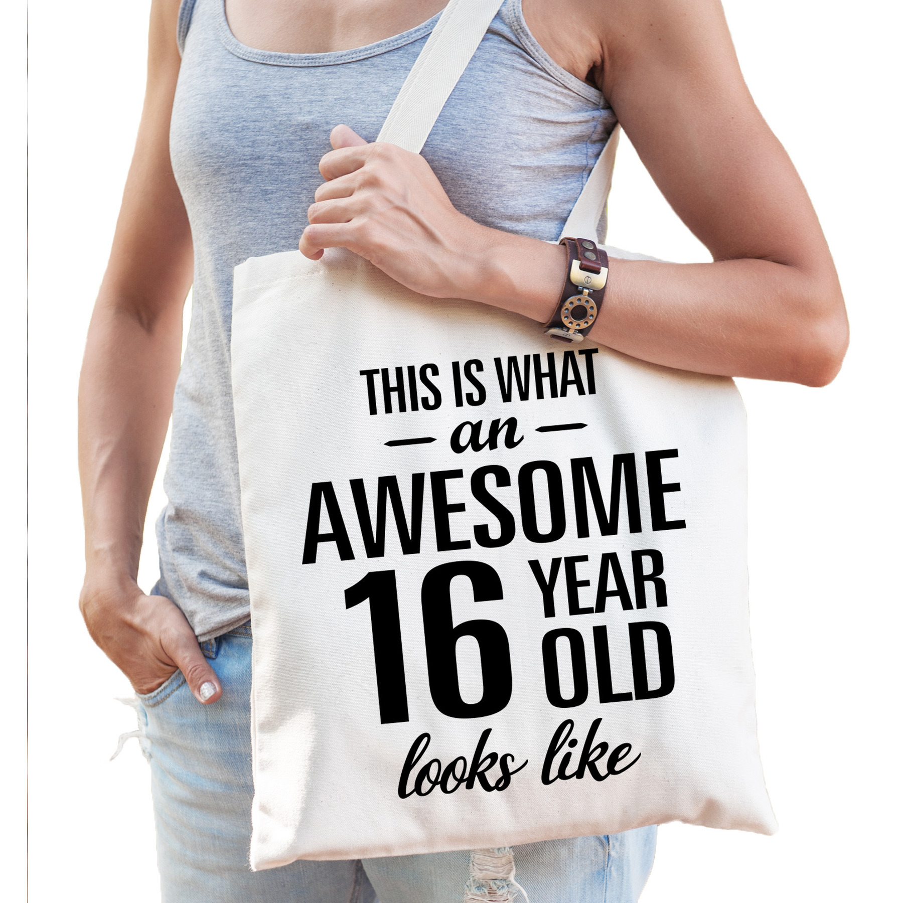 Awesome 16 year/ geweldig 16 / zestien jaar kado katoenen tas wit / creme voor dames en heren. Dit witte katoenen tasje is eenzijdig bedrukt met de tekst: This is what an awesome 16 year old looks like. Ken jij iemand die binnenkort 16 / zestien jaar wordt? En wil je hem/haar verassen met een fantastische tas? Formaat vak: 42 x 38 cm. Totale lengte inclusief hengsel: 67 cm. Materiaal: 100% katoen, 140 grams kwaliteit. Inhoud: 10 liter.