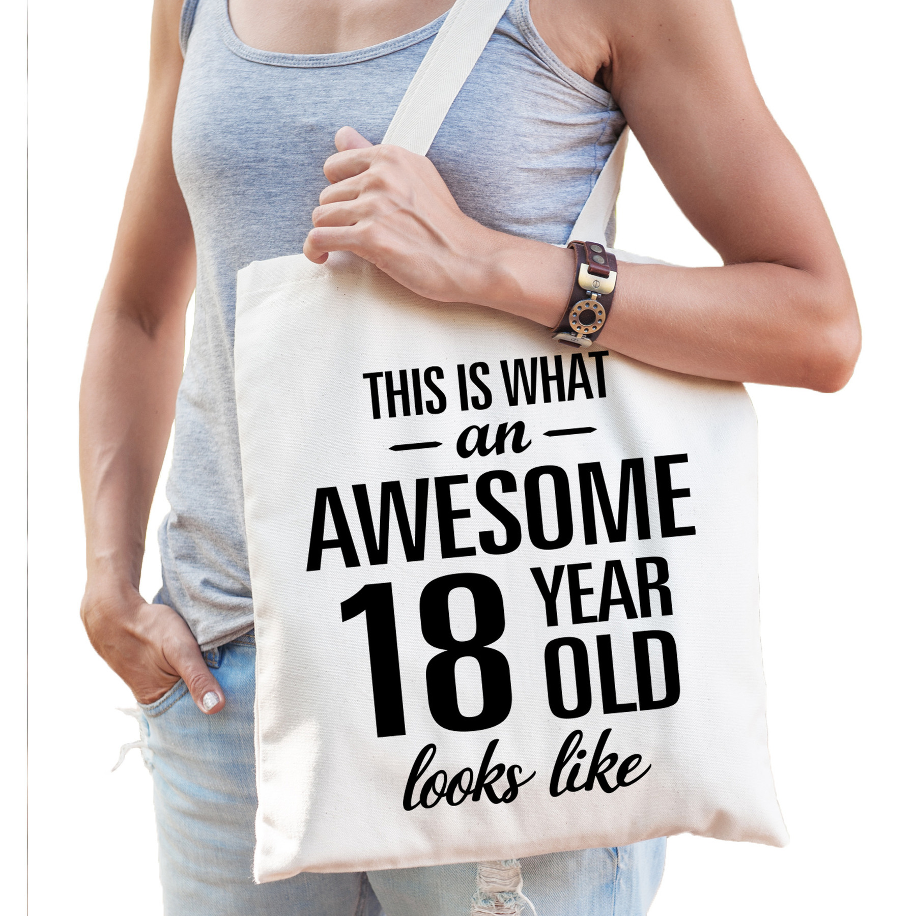 Awesome 18 year/ geweldig 18 / achttien jaar kado katoenen tas wit / creme voor dames en heren. Dit witte katoenen tasje is eenzijdig bedrukt met de tekst: This is what an awesome 18 year old looks like. Ken jij iemand die binnenkort 18 / achttien jaar wordt? En wil je hem/haar verassen met een fantastische tas? Formaat vak: 42 x 38 cm. Totale lengte inclusief hengsel: 67 cm. Materiaal: 100% katoen, 140 grams kwaliteit. Inhoud: 10 liter.