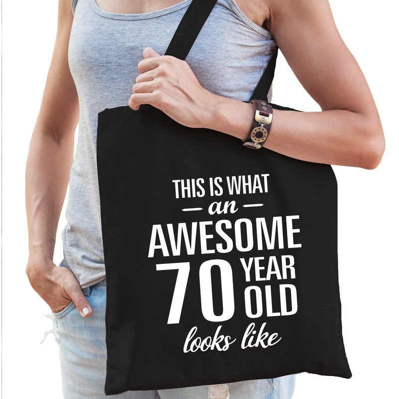 Awesome 70 year/ geweldig 70 / zeventig jaar kado katoenen tas zwart voor dames. Dit zwart katoenen tasje is eenzijdig bedrukt met de tekst: This is what an awesome 70 year old looks like.