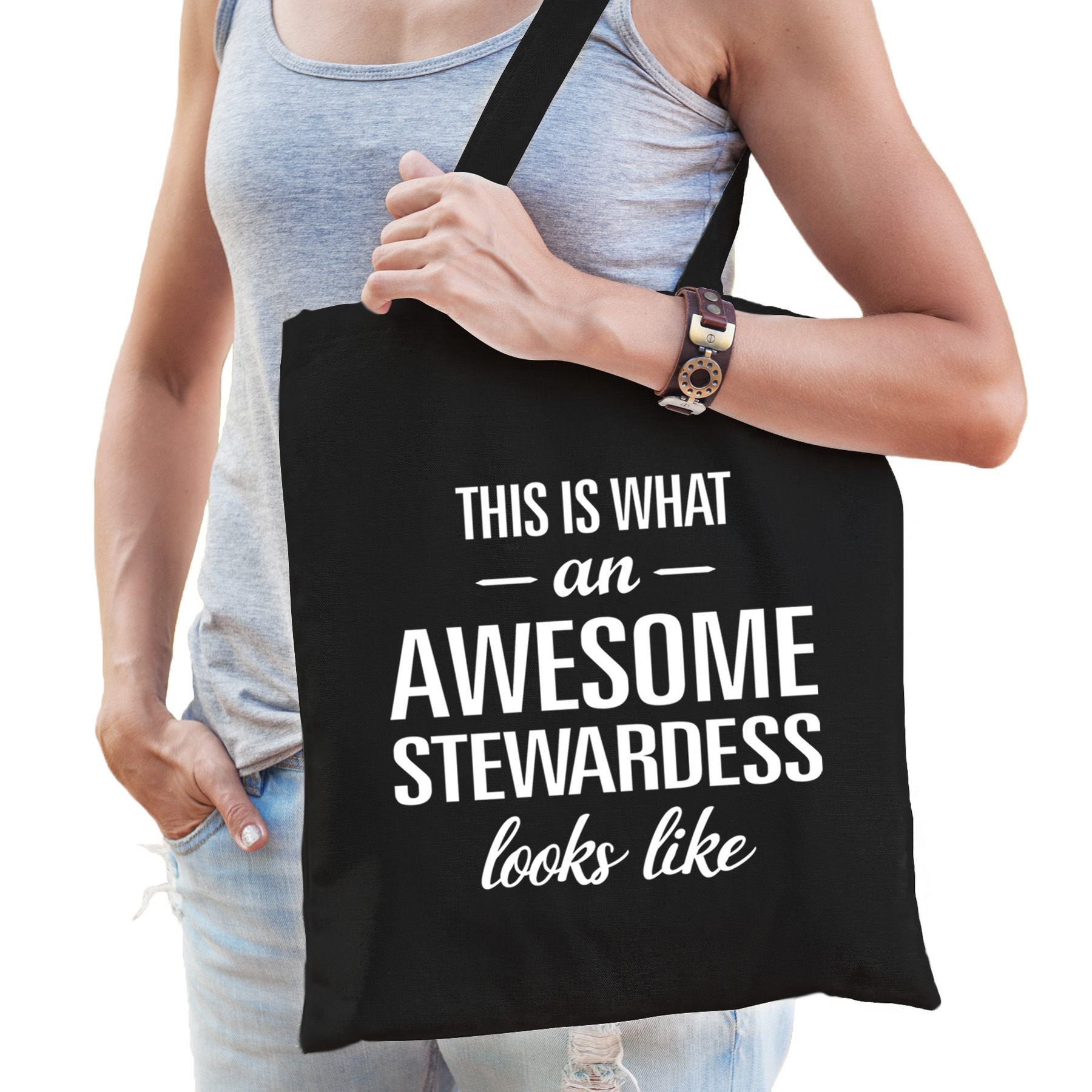 Awesome / geweldige stewardess kado katoenen tas zwart voor dames. Dit zwarte katoenen tasje is eenzijdig bedrukt met de tekst: This is what an awesome stewardess looks like.