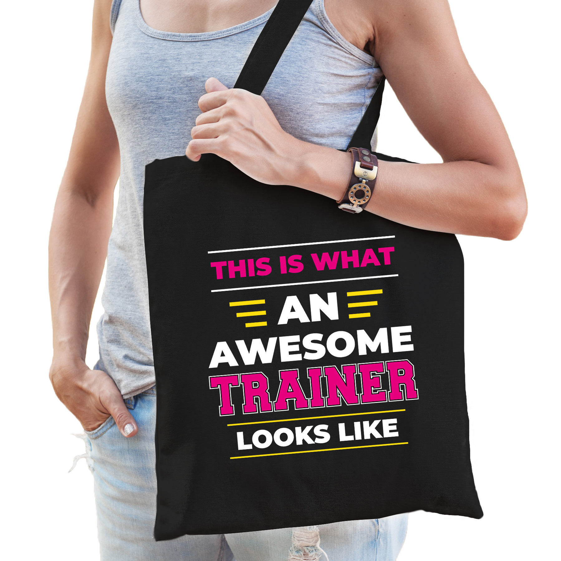 Bellatio Decorations awesome trainer tas. Zwarte tas met de opdruk; This is what an awesome trainer looks like. Verras jouw geweldige trainer met dit leuke cadeau tasje! Formaat: ca. 42 x 38 cm. Totale lengte inclusief hengsel: ca. 67 cm. Materiaal: 100% katoen, 140 grams kwaliteit. Inhoud: 10 liter.