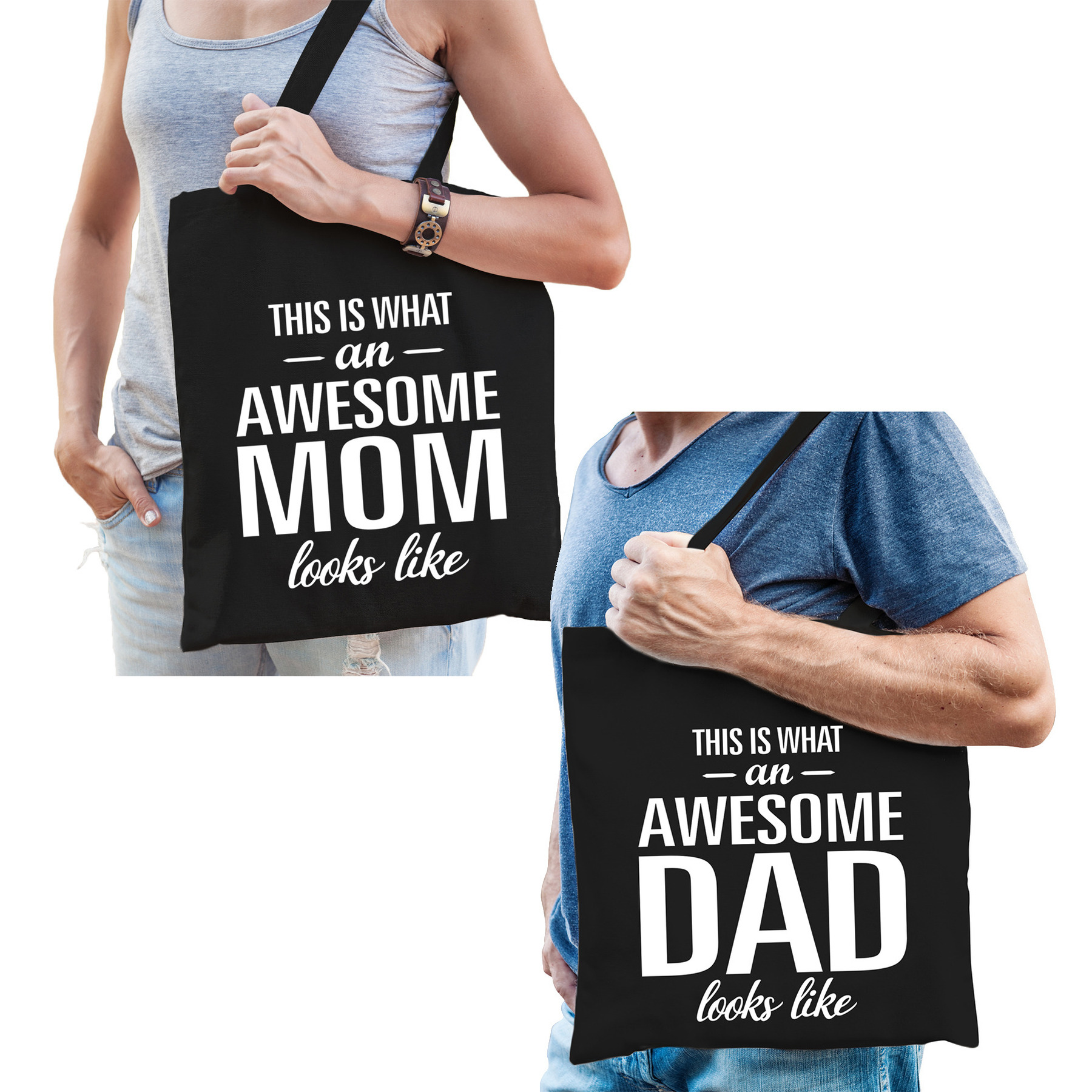 Awesome Mom en Awesome Dad tasje – Cadeau tassen set voor Papa en Mama. Katoenen tasjes cadeau set voor papa en mama, bestaande uit 2 tassen uit dezelfde serie. Een leuke boodschappen tas voor je mama en voor papa! Koop in 1 keer een cadeau voor Moederdag en Vaderdag, voor hun verjaardagen of gewoon omdat ze de beste papa en mama zijn.
