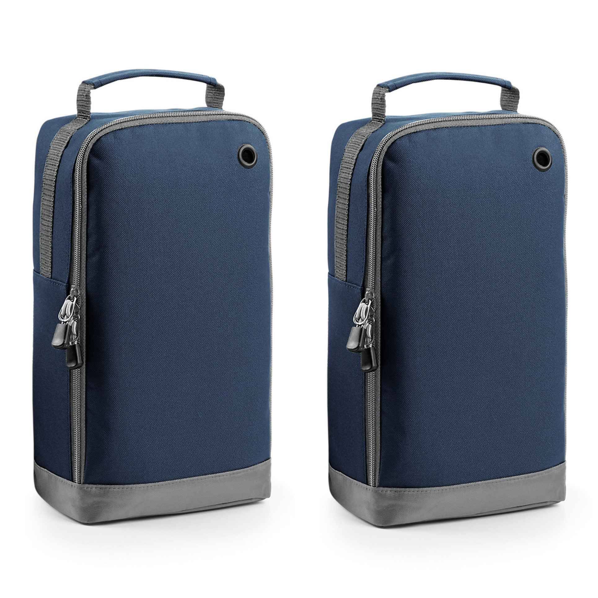 2 stuks schoenentas van 8 liter, in het donkerblauw, voor 1 paar schoenen. Voorzien van grote ritssluiting. Inhoud: 8 liter. Formaat: 35 x 19 x 12 cm. Materiaal: 100% polyester 420D. Reistas/opbergtas voor schoenen.