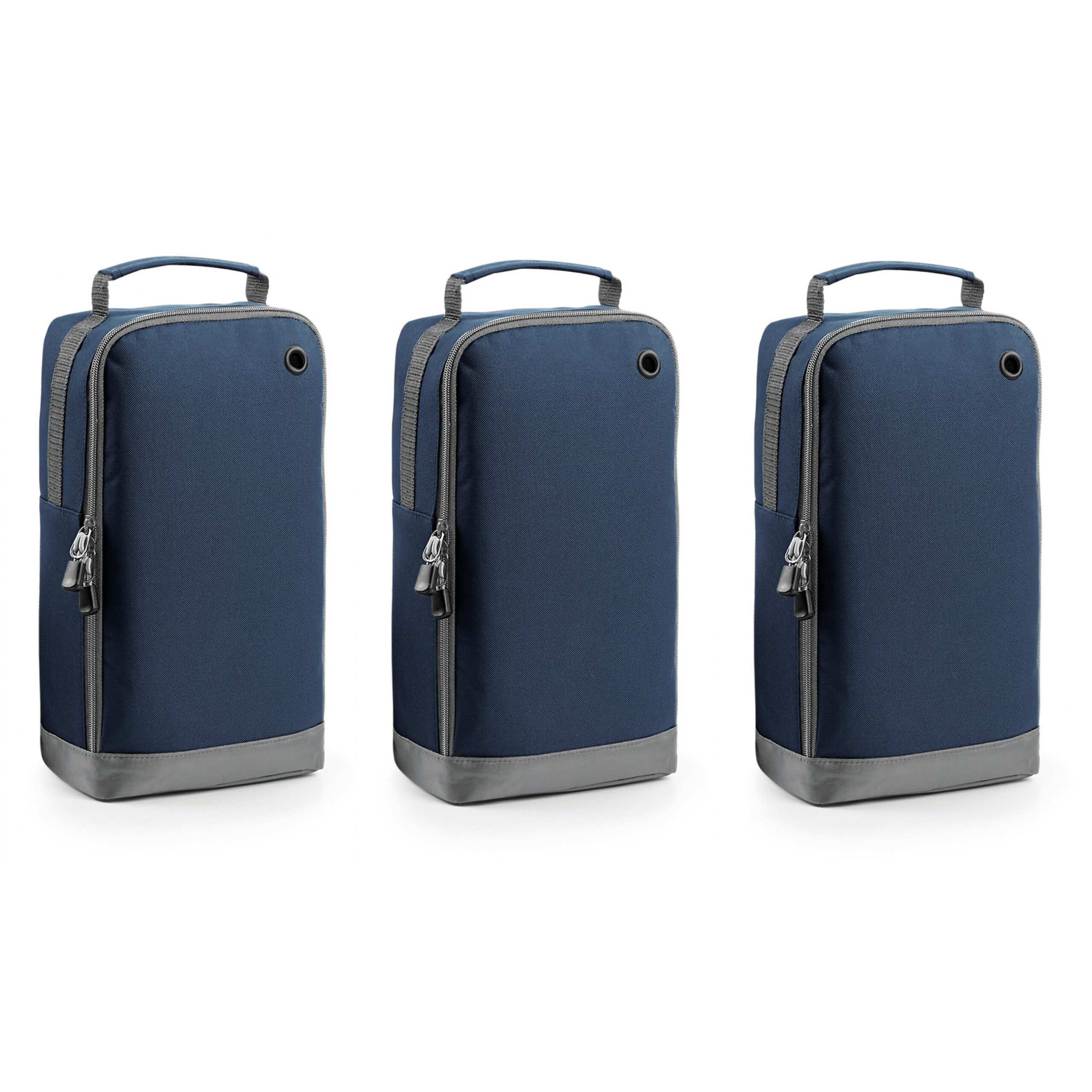 3 stuks schoenentas van 8 liter, in het donkerblauw, voor 1 paar schoenen. Voorzien van grote ritssluiting. Inhoud: 8 liter. Formaat: 35 x 19 x 12 cm. Materiaal: 100% polyester 420D. Reistas/opbergtas voor schoenen.