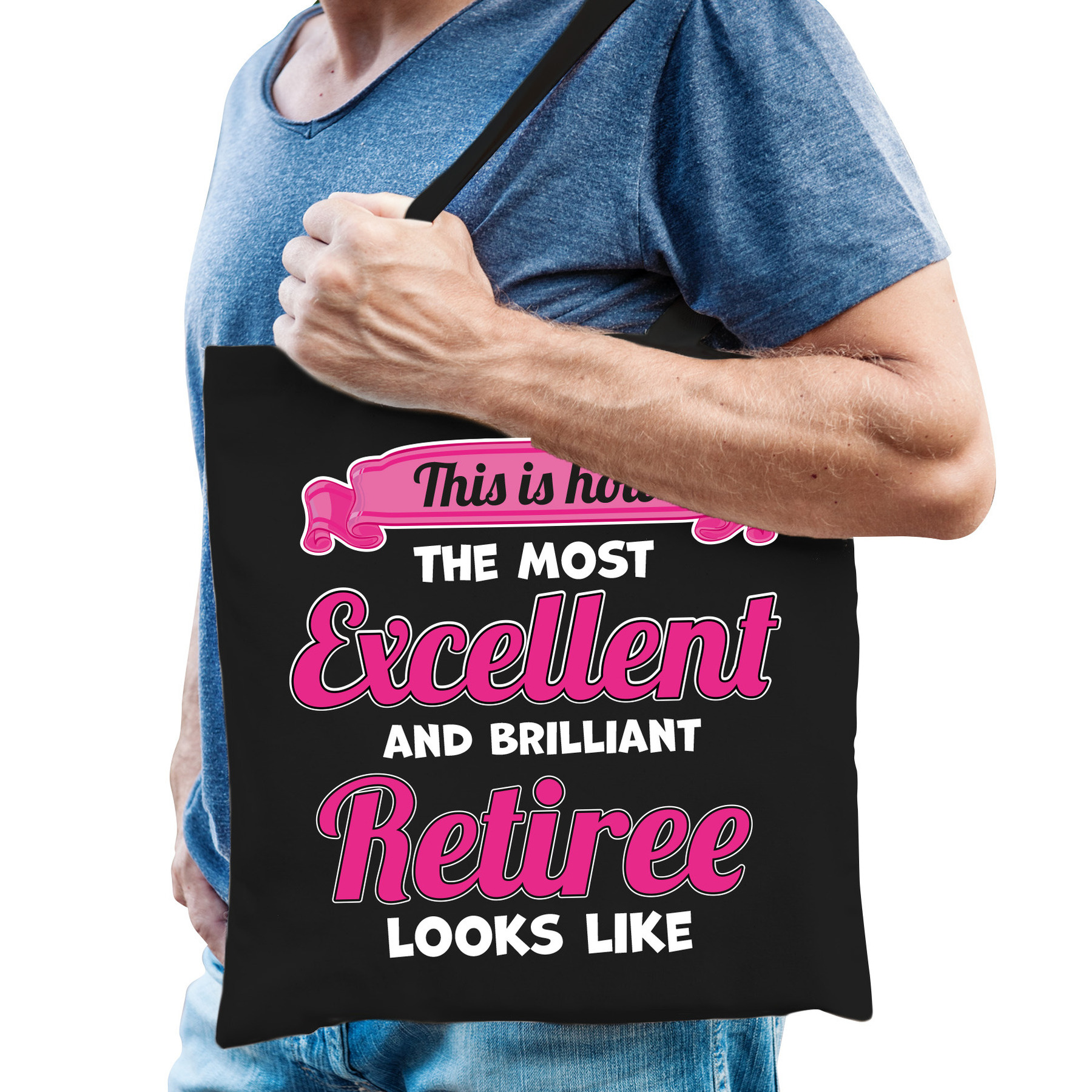 Katoenen cadeau tas voor heren. Geef je favoriete collega het perfecte afscheidscadeau met deze stijlvolle cadeau tas! De tas in zwart/roze heeft de vrolijke tekst “This is how the most Excellent and Brilliant Retiree looks like” en is de ideale manier om je waardering te laten zien. Gemaakt van stevig katoen, biedt de tas genoeg ruimte voor al zijn nieuwe benodigdheden in zijn pensioenavontuur. Of hij hem nu gebruikt voor zijn boodschappen, op reis gaat of gewoon als dagelijkse tas, deze tas zal zijn altijd herinneren aan de fijne tijd samen. Een praktisch en persoonlijk aandenken dat zowel stijlvol als functioneel is! “Met deze tas draag je je beste herinneringen altijd bij je, als het pensioen begint!” Een handige tote bag voor zijn spullen. Materiaal: 100% katoen, 140 grams kwaliteit. Formaat vak: ca. 42 x 38 cm. Totale lengte inclusief hengsel: ca. 67 cm. Inhoud: ca. 10 liter. Merk: Bellatio Decorations.