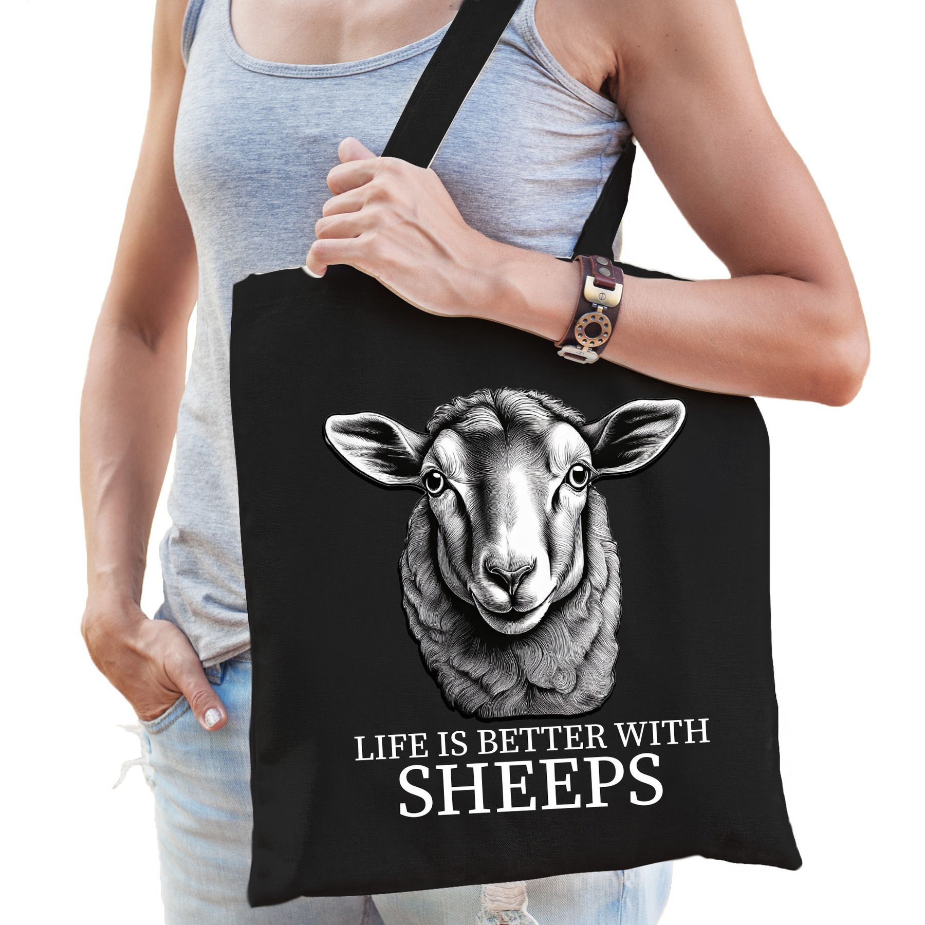 Op zoek naar een origineel cadeau voor een schapenfan of boerderijdierenliefhebber? Deze zwarte katoenen tas met vrolijke schapenprint is een schot in de roos! Perfect om een presentje in te verpakken, maar stiekem z? leuk dat je ?m liever zelf houdt. De tas is herbruikbaar, licht ?n handig voor een snelle boodschap, een dagje uit of gewoon als vrolijke eyecatcher. Een handige tote bag voor allerlei spullen. Materiaal: 100% katoen, 140 grams kwaliteit. Formaat vak: ca. 42 x 38 cm. Totale lengte inclusief hengsel: ca. 67 cm. Inhoud: ca. 10 liter. Merk: Bellatio Decorations.