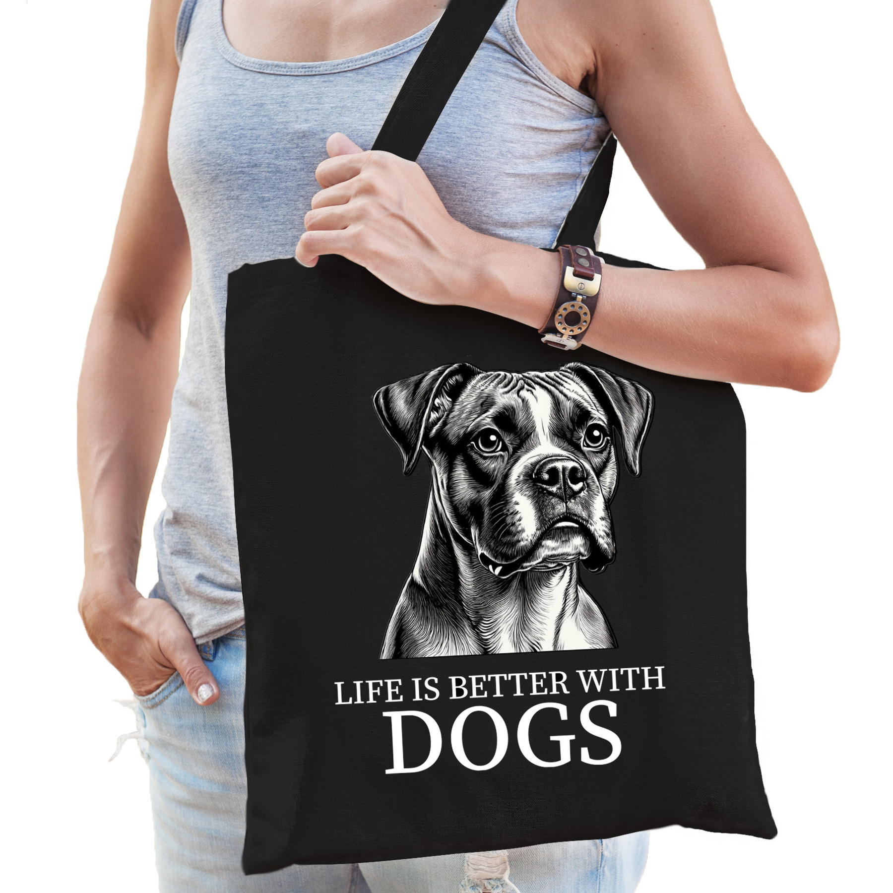 Katoenen cadeau honden tas voor dames/heren en kinderen. Deze Cadeau Honden Tas is het perfecte accessoire voor hondenliefhebbers! Met een schattige afbeelding van de Boxer hond op het zwarte katoen, is deze tas een geweldige manier om je liefde voor honden te tonen. Of je nu onderweg bent naar een uitje of boodschappen doet, de tas biedt genoeg ruimte en is ideaal voor zowel heren, dames als kinderen. Het katoen zorgt ervoor dat je tas er niet alleen stijlvol uitziet, maar ook praktisch in gebruik is. Een handige tote bag voor allerlei spullen. Materiaal: 100% katoen, 140 grams kwaliteit. Formaat vak: ca. 42 x 38 cm. Totale lengte inclusief hengsel: ca. 67 cm. Inhoud: ca. 10 liter. Merk: Bellatio Decorations.