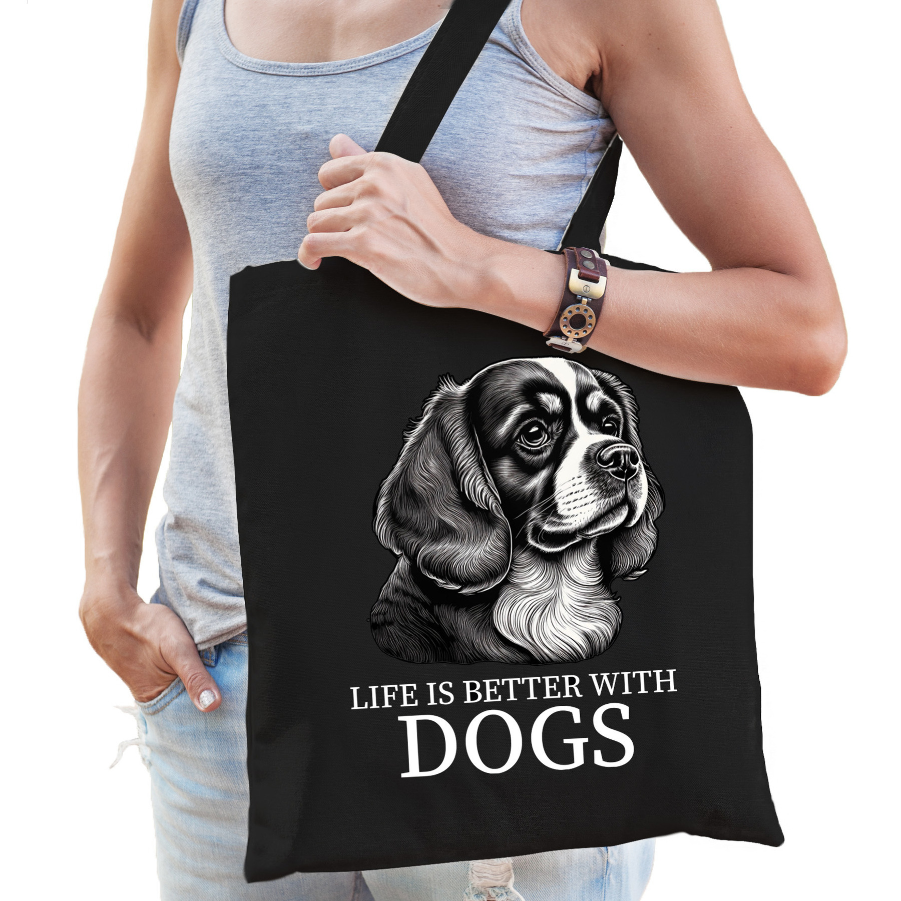 Katoenen cadeau honden tas voor dames/heren en kinderen. Deze Cadeau Honden Tas is het perfecte accessoire voor hondenliefhebbers! Met een schattige afbeelding van de Cavalier King Charles hond op het zwarte katoen, is deze tas een geweldige manier om je liefde voor honden te tonen. Of je nu onderweg bent naar een uitje of boodschappen doet, de tas biedt genoeg ruimte en is ideaal voor zowel heren, dames als kinderen. Het katoen zorgt ervoor dat je tas er niet alleen stijlvol uitziet, maar ook praktisch in gebruik is. Een handige tote bag voor allerlei spullen. Materiaal: 100% katoen, 140 grams kwaliteit. Formaat vak: ca. 42 x 38 cm. Totale lengte inclusief hengsel: ca. 67 cm. Inhoud: ca. 10 liter. Merk: Bellatio Decorations.