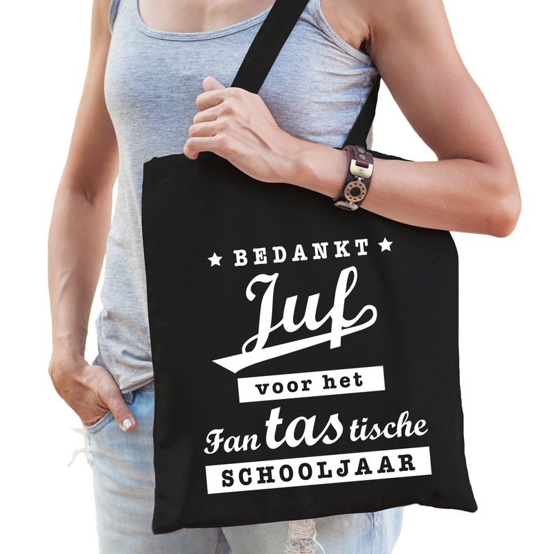 Katoenen cadeau tasje Bedankt juf voor het fanTAStische schooljaar, in de kleur zwart. Leuk om cadeau te geven aan de juf/leerkracht, bijvoorbeeld aan het einde van een schooljaar. Dit zwarte katoenen tasje is eenzijdig bedrukt met de tekst Bedankt JUF voor het fanTAStische schooljaar.