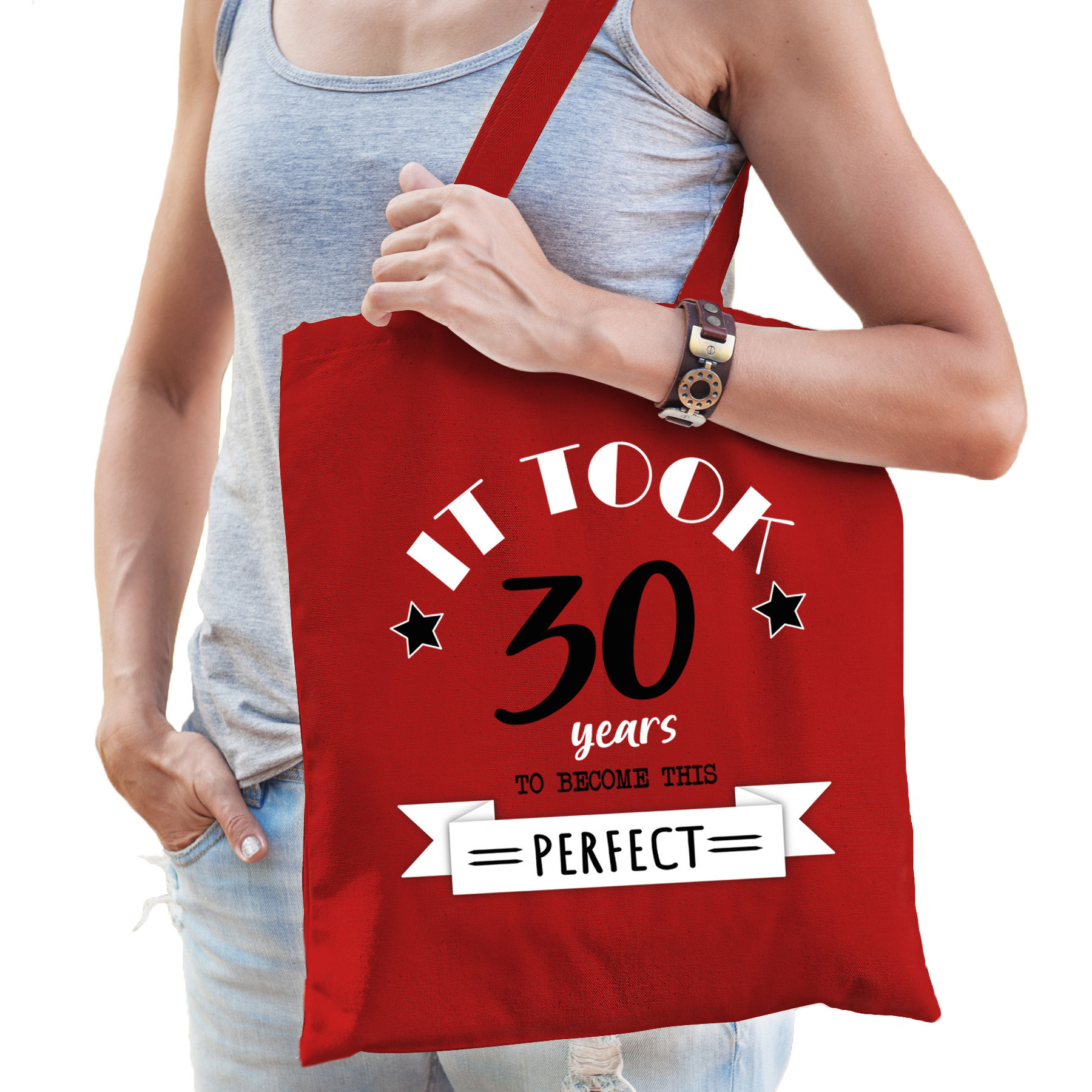 Katoenen cadeau tas/tote bag voor dames in de kleur rood. Het perfecte cadeau voor de dame die dertig jaar is geworden! De shopper is eenzijdig bedrukt met de tekst: it took 30 years to become this perfect. Het cadeau tasje is leuk om cadeau te geven voor haar 30e verjaardag. Ook leuk om er bijvoorbeeld cadeaus in te doen en de goodiebag aan de jarige te geven!