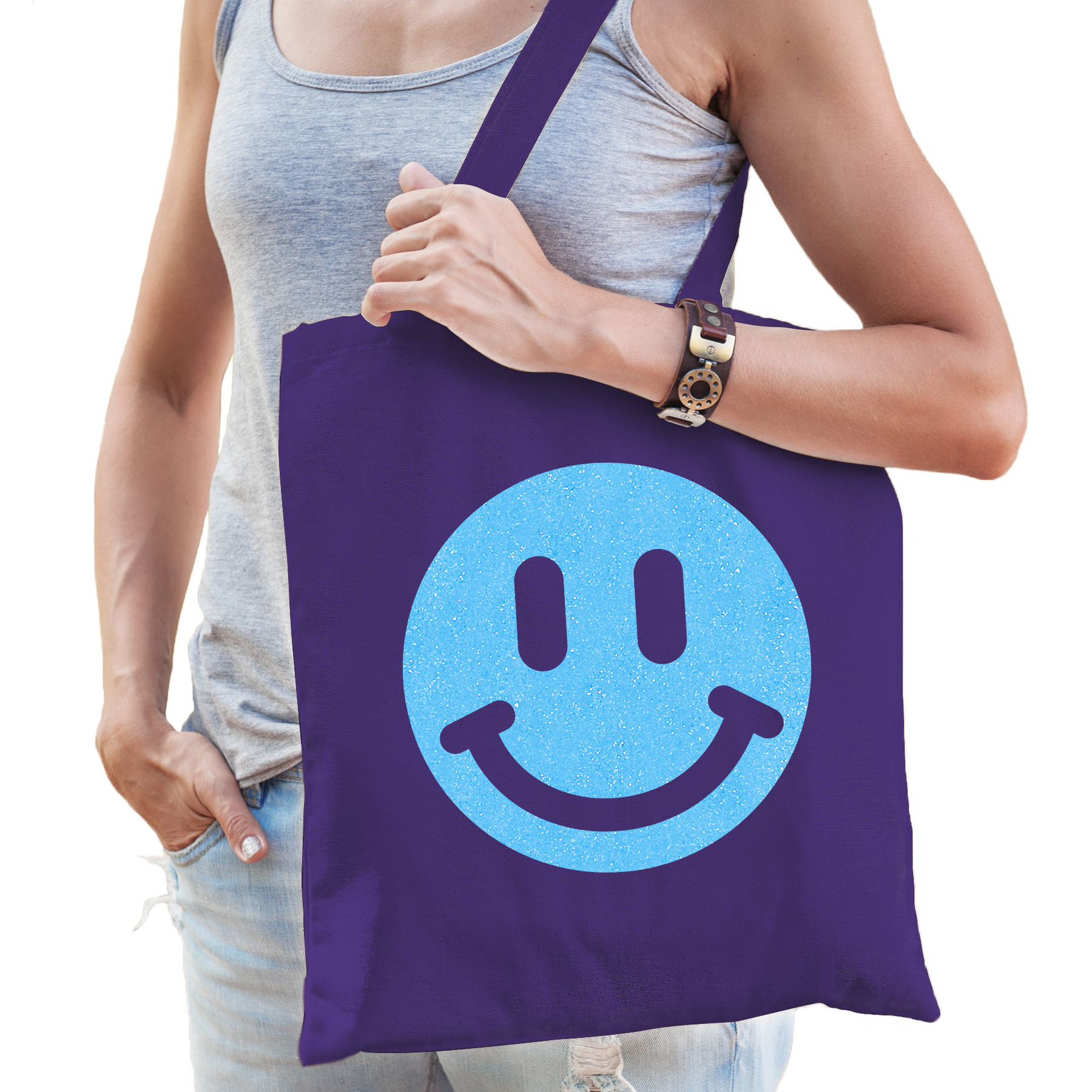 Katoenen cadeau tas voor dames in de kleur paars. De shopper is eenzijdig bedrukt met: een Smile Emoticon, in blauwe glitter. Geef dit leuke tasje cadeau voor Moederdag, haar verjaardag of gewoon zomaar om te laten zien dat je haar super vindt! Een handige tote bag voor haar spullen. Materiaal: 100% katoen, 140 grams kwaliteit. Formaat vak: ca. 42 x 38 cm. Totale lengte inclusief hengsel: ca. 67 cm. Inhoud: ca. 10 liter. Merk: Bellatio Decorations.