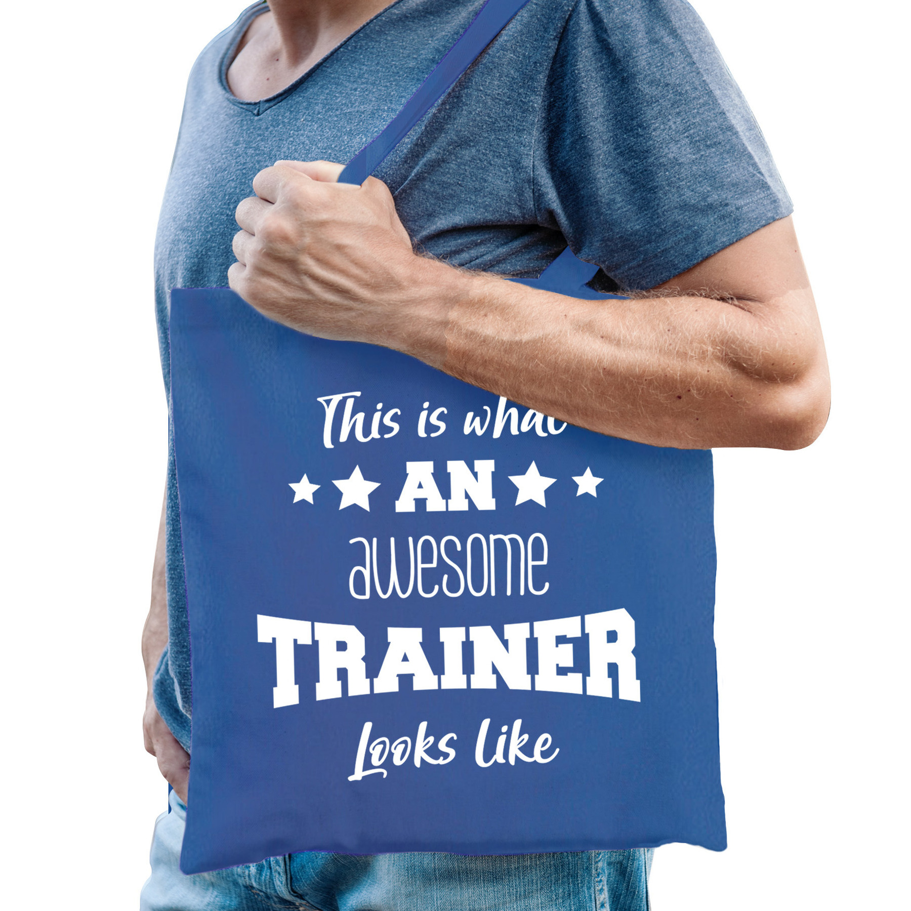 Bellatio Decorations katoenen cadeau tas/shopper/tote bag voor trainers in de kleur blauw. De shopper is eenzijdig bedrukt met de tekst: This is what an awesome trainer looks like. Verdient jouw sportbegeleider wel wat waardering? Geef dan dit leuke tasje cadeau! Bijvoorbeeld aan het einde van het sportseizoen. Materiaal: 100% katoen, 140 grams kwaliteit. Formaat vak: ca. 42 x 38 cm. Totale lengte inclusief hengsel: ca. 67 cm. Inhoud: ca. 10 liter.