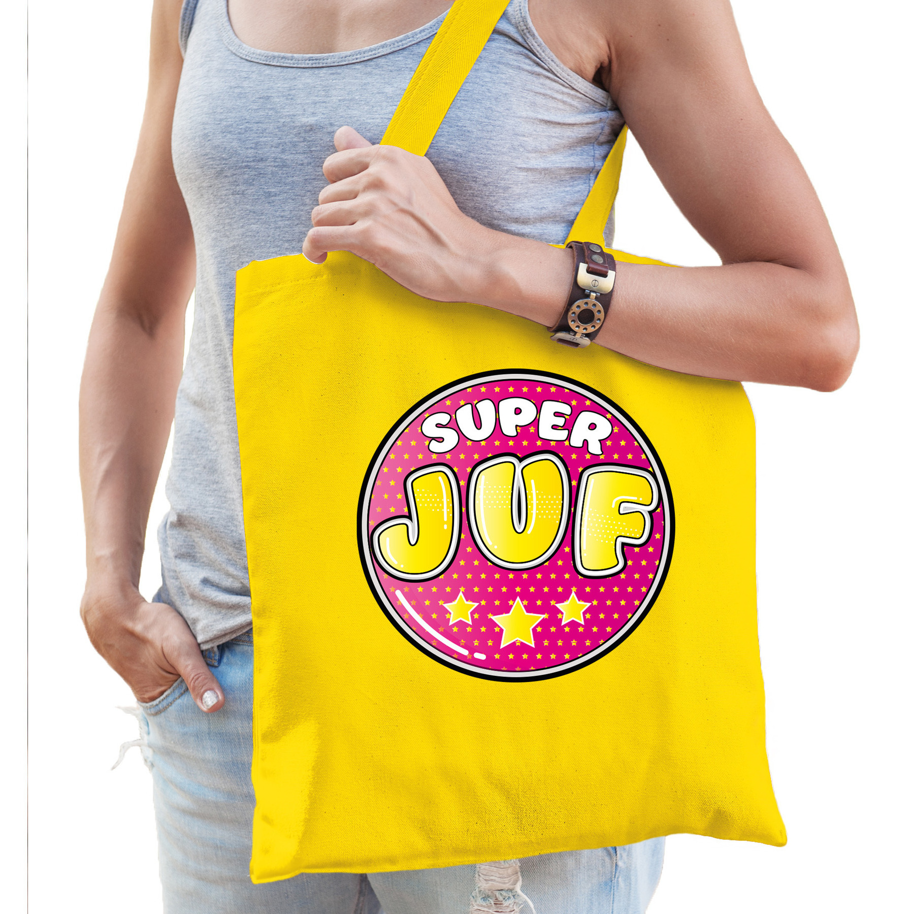 Bellatio Decorations cadeau tas/shopper/tote bag voor jouw favoriete juf in de kleur geel. Het tasje is eenzijdig bedrukt met een button en de tekst; Super juf. Geef dit leuke tasje bijvoorbeeld met juffen en meesterdag of als bedankje aan het einde van het schooljaar. Formaat vak: ca. 42 x 38 cm. Totale lengte inclusief hengsel: 67 cm. Materiaal: 100% katoen, 140 grams kwaliteit. Inhoud: 10 liter.