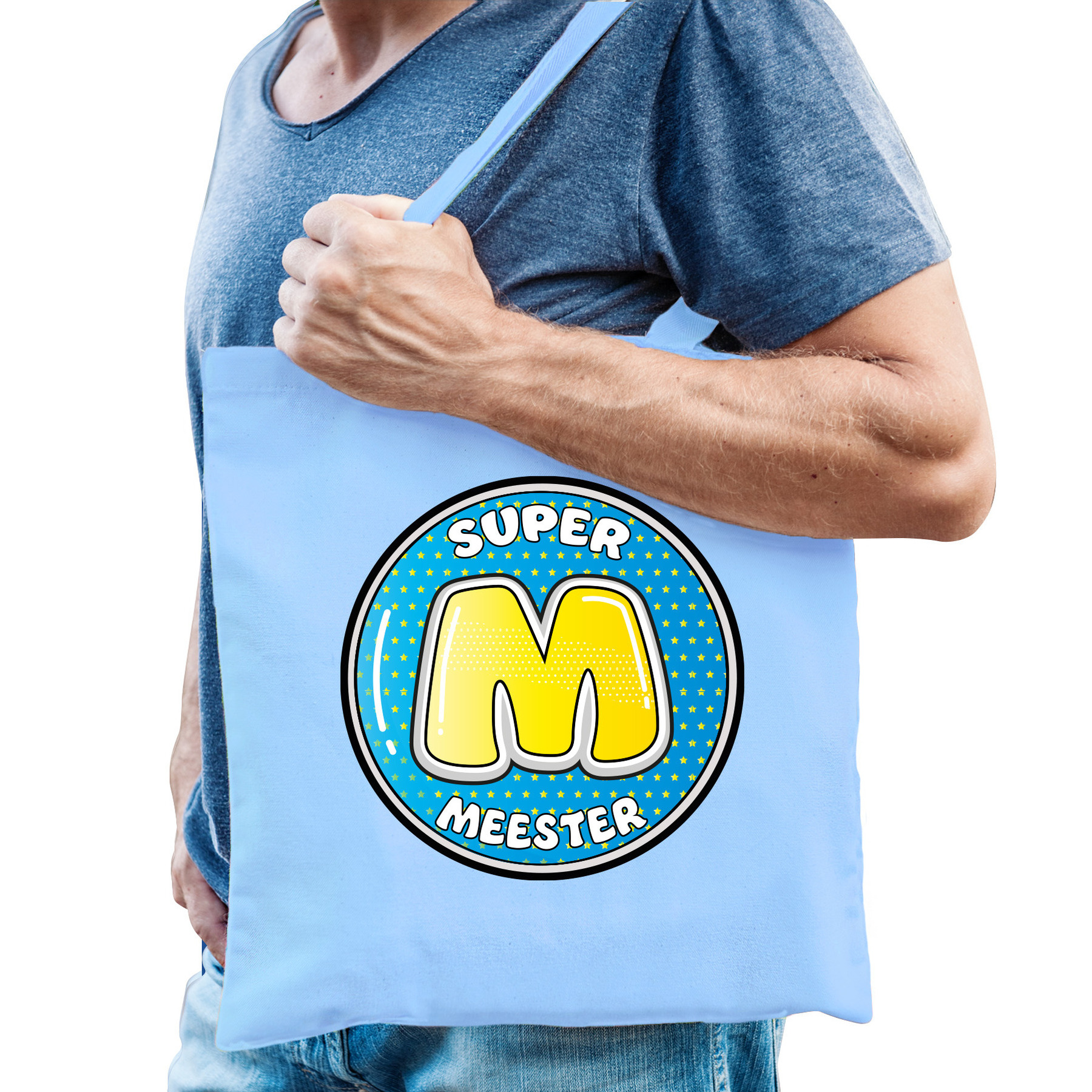 Bellatio Decorations cadeau tas/shopper/tote bag voor jouw favoriete meester in de kleur lichtblauw. Het tasje is eenzijdig bedrukt met een button en de tekst; Super meester. Geef dit leuke tasje bijvoorbeeld met juffen en meesterdag of als bedankje aan het einde van het schooljaar. Formaat vak: ca. 42 x 38 cm. Totale lengte inclusief hengsel: 67 cm. Materiaal: 100% katoen, 140 grams kwaliteit. Inhoud: 10 liter.
