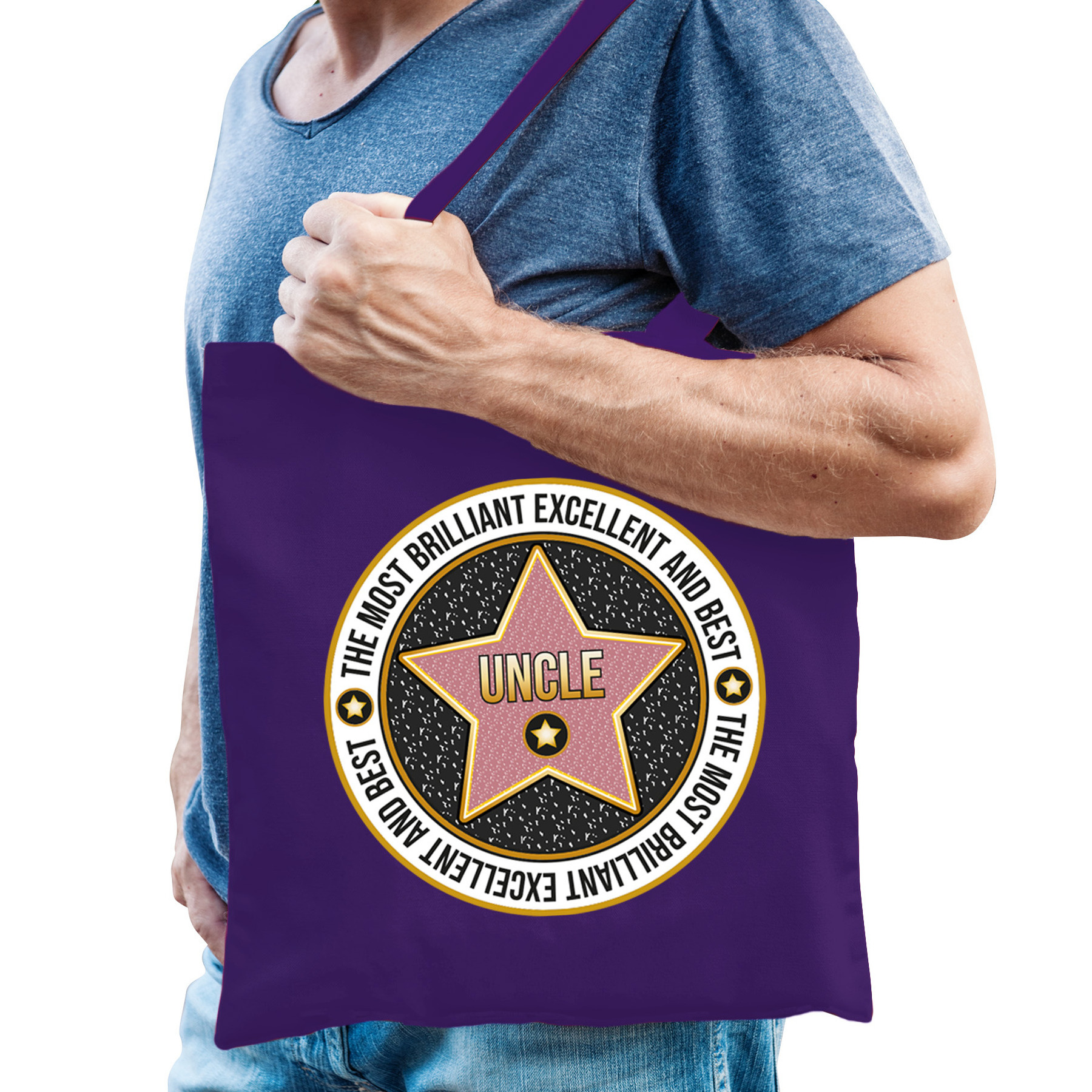 Katoenen cadeau tas voor je oom in de kleur paars. De shopper is eenzijdig bedrukt met de tekst: The most brilliant excellent and best uncle, met een ster. Verdient jouw oom wel wat waardering? Geef dan dit leuke tasje cadeau! Bijvoorbeeld voor zijn verjaardag of gewoon zomaar om te laten zien dat je hem super vindt! Een handige tote bag voor zijn spullen. Materiaal: 100% katoen, 140 grams kwaliteit. Formaat vak: ca. 42 x 38 cm. Totale lengte inclusief hengsel: ca. 67 cm. Inhoud: ca. 10 liter. Merk: Bellatio Decorations.