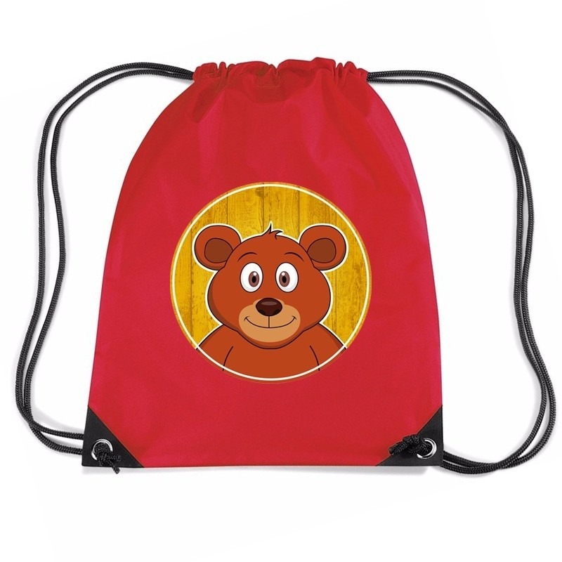 Beren rugtas / gymtas rood voor kinderen. Dit rode rugzakje is bedrukt met een vrolijk beertje. Deze trekkoord rugzak is ideaal als gymtas, zwemtas of sporttas. De nylon rugzak is van waterafstotende stof en heeft rijgkoord. De inhoud van de gymtas is ongeveer 11 liter en de afmeting 45 x 34 cm.