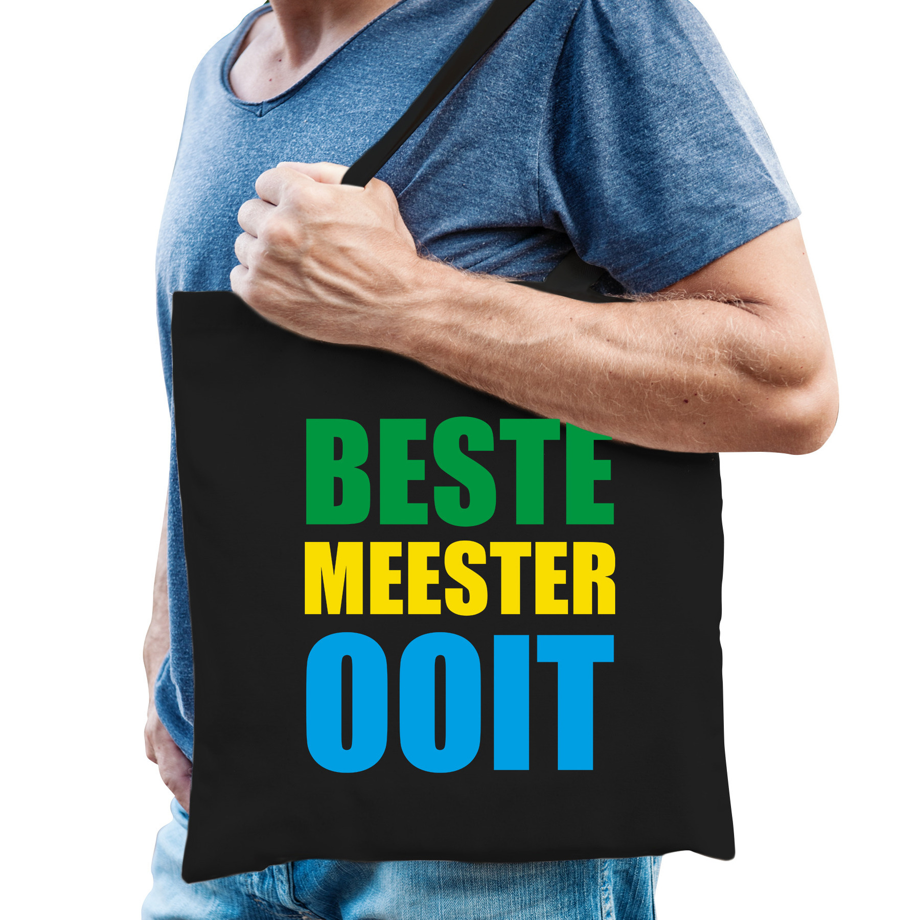 Beste meester ooit cadeau tas zwart voor heren. Dit zwarte tasje is eenzijdig bedrukt met gekleurde letters met de tekst: BESTE MEESTER OOIT. Iemand verassen met een fantastisch cadeau shirt?