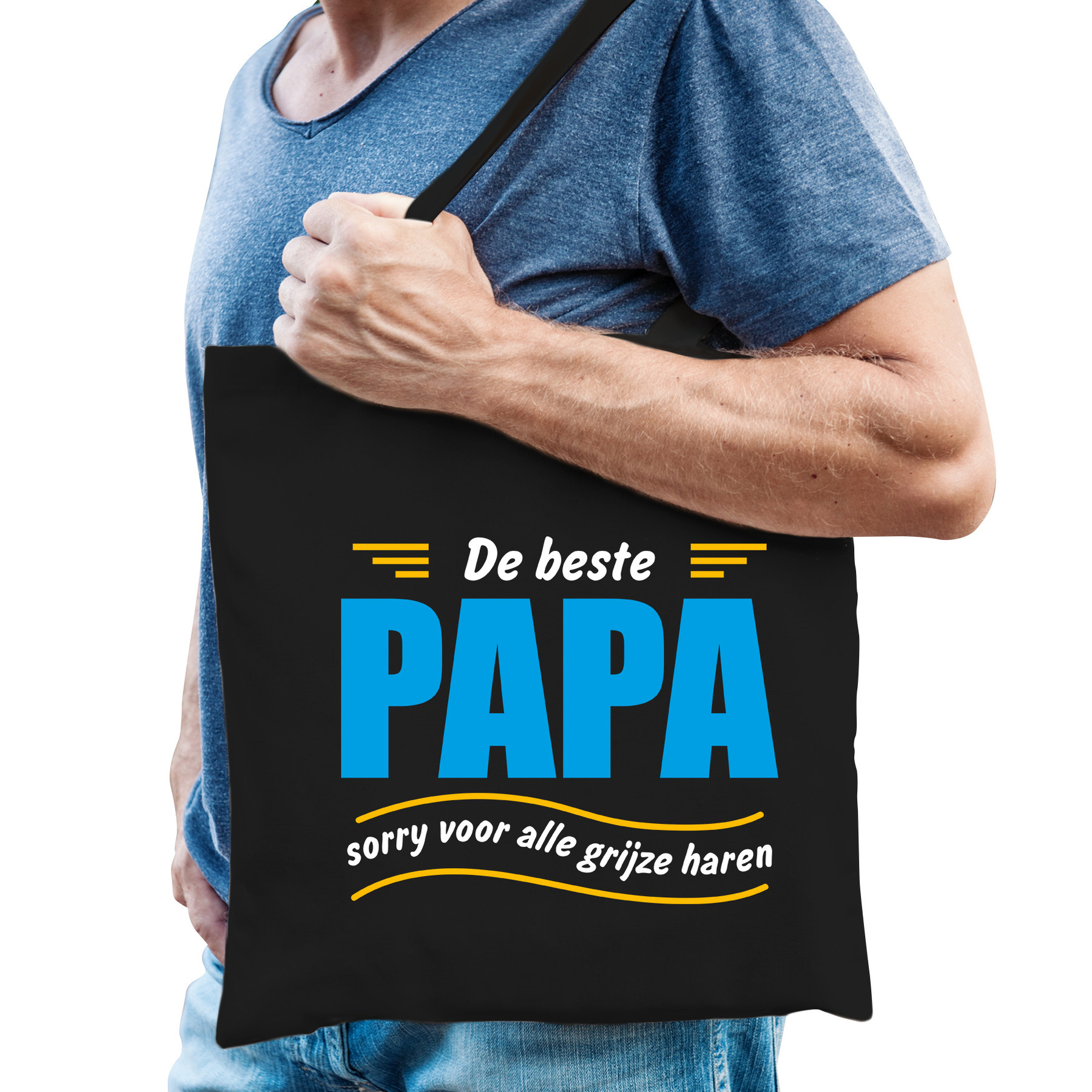 Beste papa cadeau tas zwart voor heren. Dit zwarte katoenen kado tasje is eenzijdig bedrukt met de tekst: De beste papa, sorry voor alle grijze haren. Een leuk kado idee voor Vaderdag of als cadeau voor de verjaardag van uw vader / papa.
