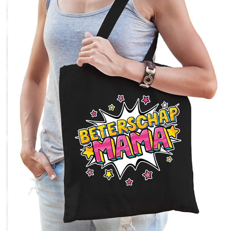 Dit zwart katoenen tasje is eenzijdig bedrukt met de tekst: Beterschap mama.