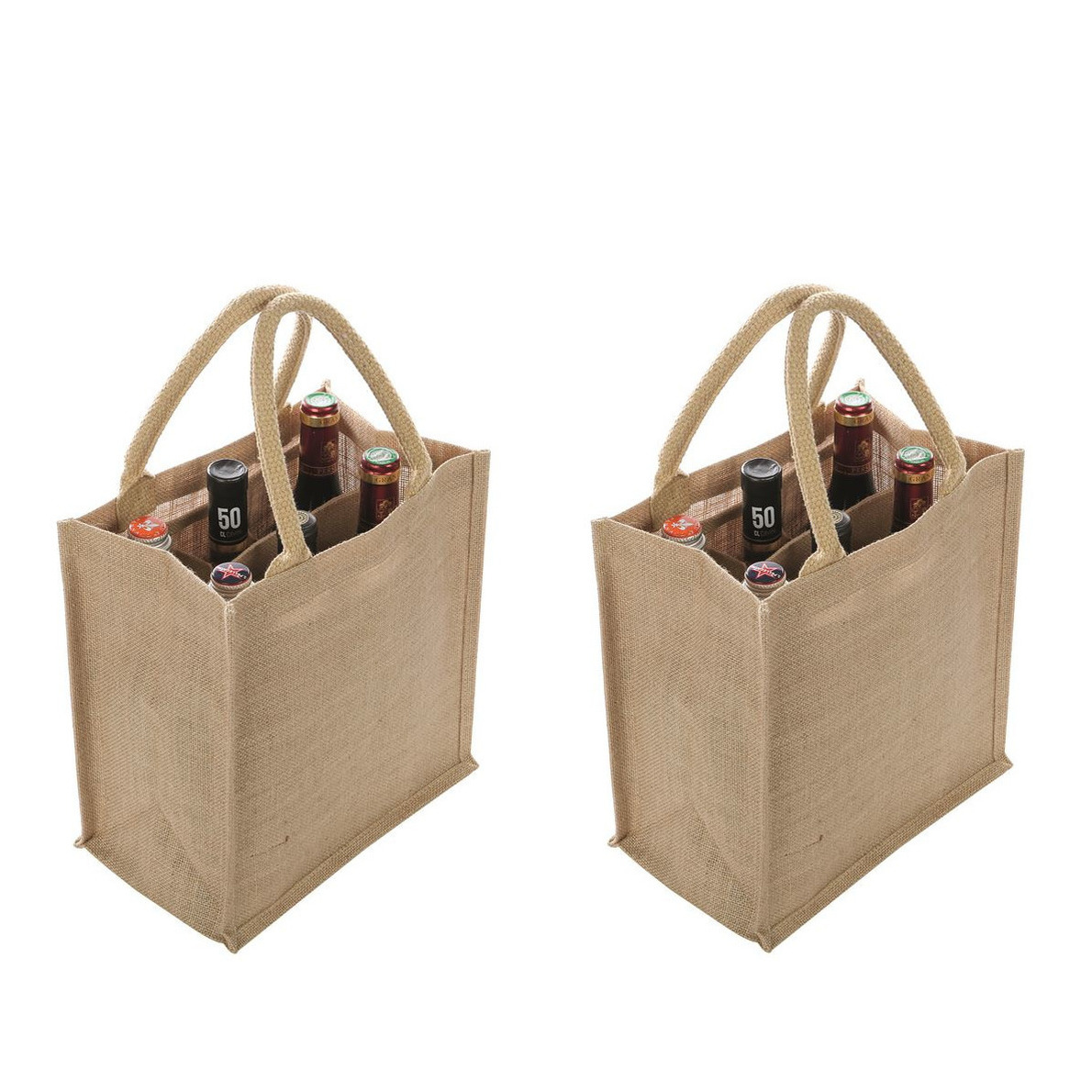 2x jute boodschappentas/strandtas 29 x 27 cm naturel. Stevige, herbruikbare tas met van jute met inklapbare vakverdeling voor 6 flessen. Het formaat van de tas is ca. 29 x 18 x 27 cm. Ideaal om te gebruiken voor je boodschappen of om mee te nemen naar het strand, maar ook uitermate geschikt als cadeauverpakking. Materiaal: jute.
