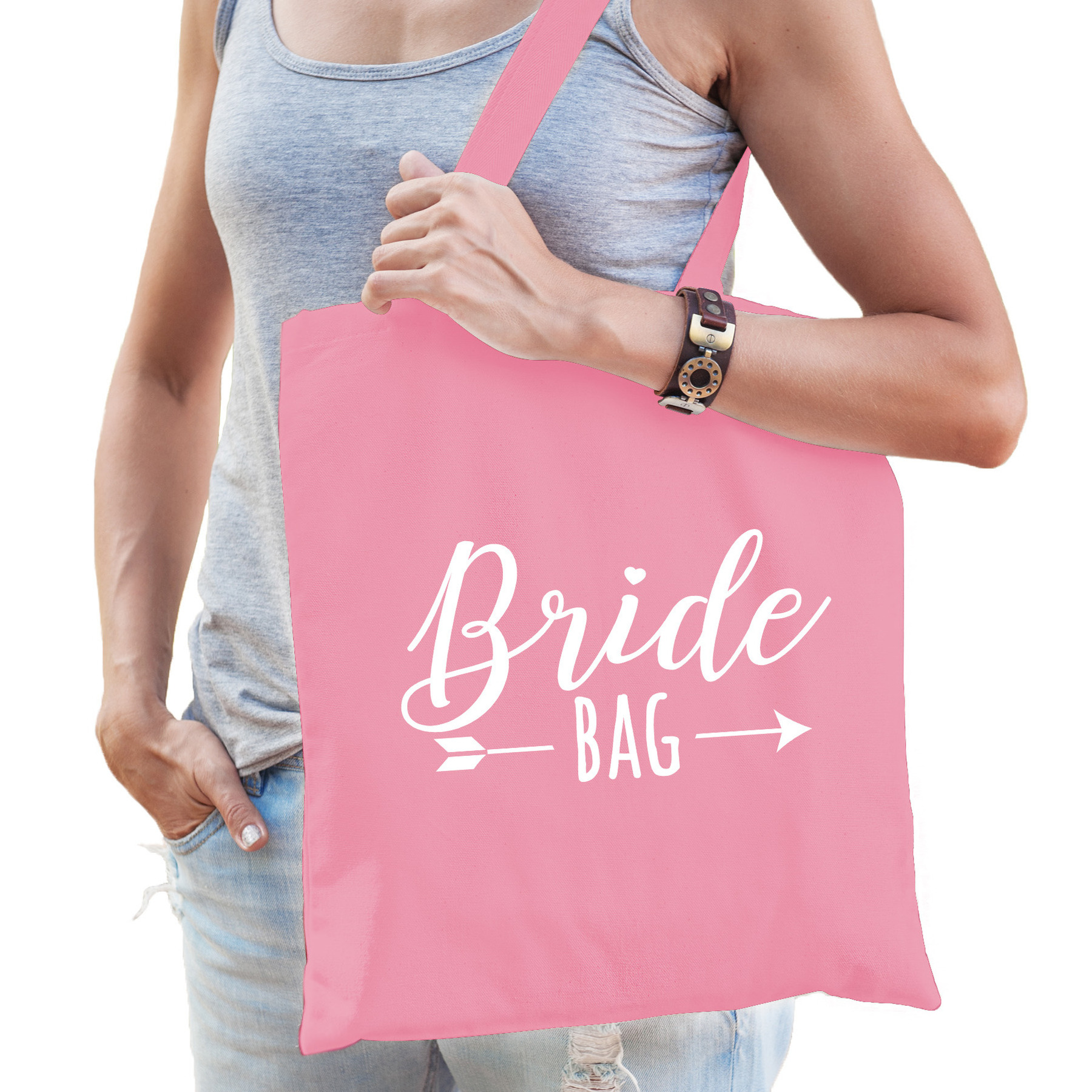 Bride bag katoenen tasje licht roze dames. Op dit zwarte tasje staat de tekst: Bride bag. Leuk tasje voor de aanstaande bruid, als accessoire of als tasje voor de bruidsmeisjes.Formaat vak: 42 x 38 cm. Totale lengte inclusief hengsel: 67 cm. Materiaal: 100% katoen, 140 grams kwaliteit. Inhoud: 10 liter.