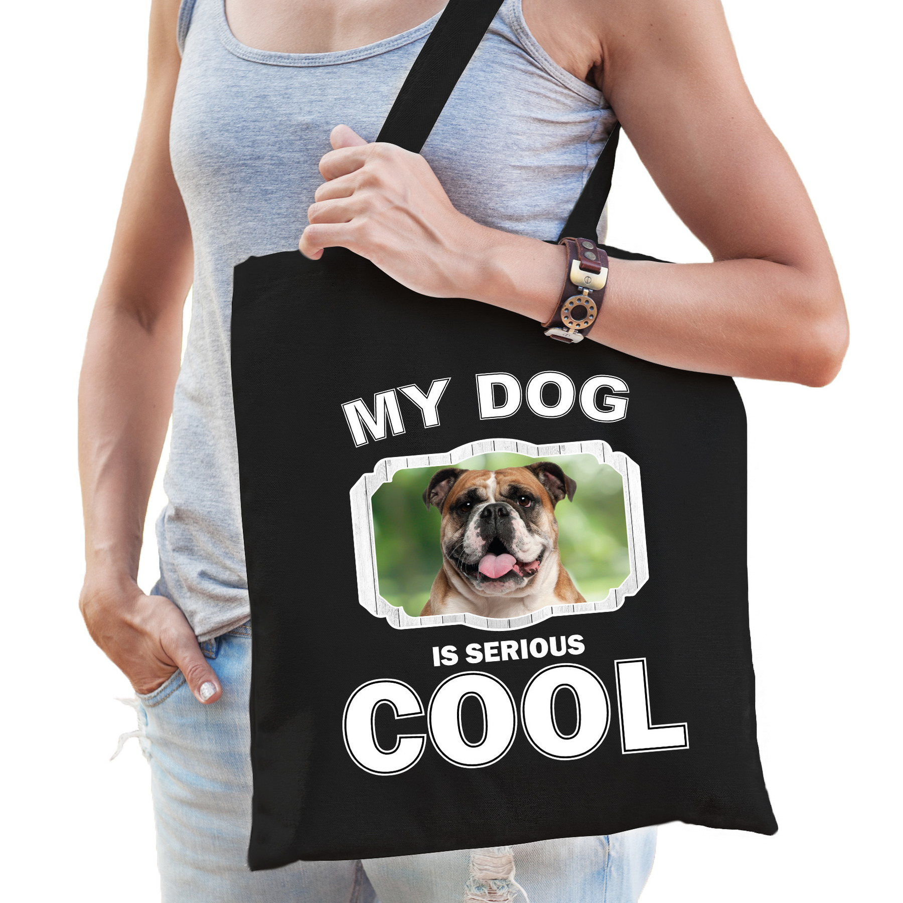 Britse bulldog honden tasje zwart volwassenen en kinderen. Op deze tas staat een Britse bulldog afbeelding en de tekst: my dog is serious cool. Een musthave voor een echte dieren/ Britse bulldogs liefhebber of iemand die alles van honden spaart. Erg leuk om cadeau te doen aan een echte Britse bulldogs fan of gewoon om zelf te gebruiken!