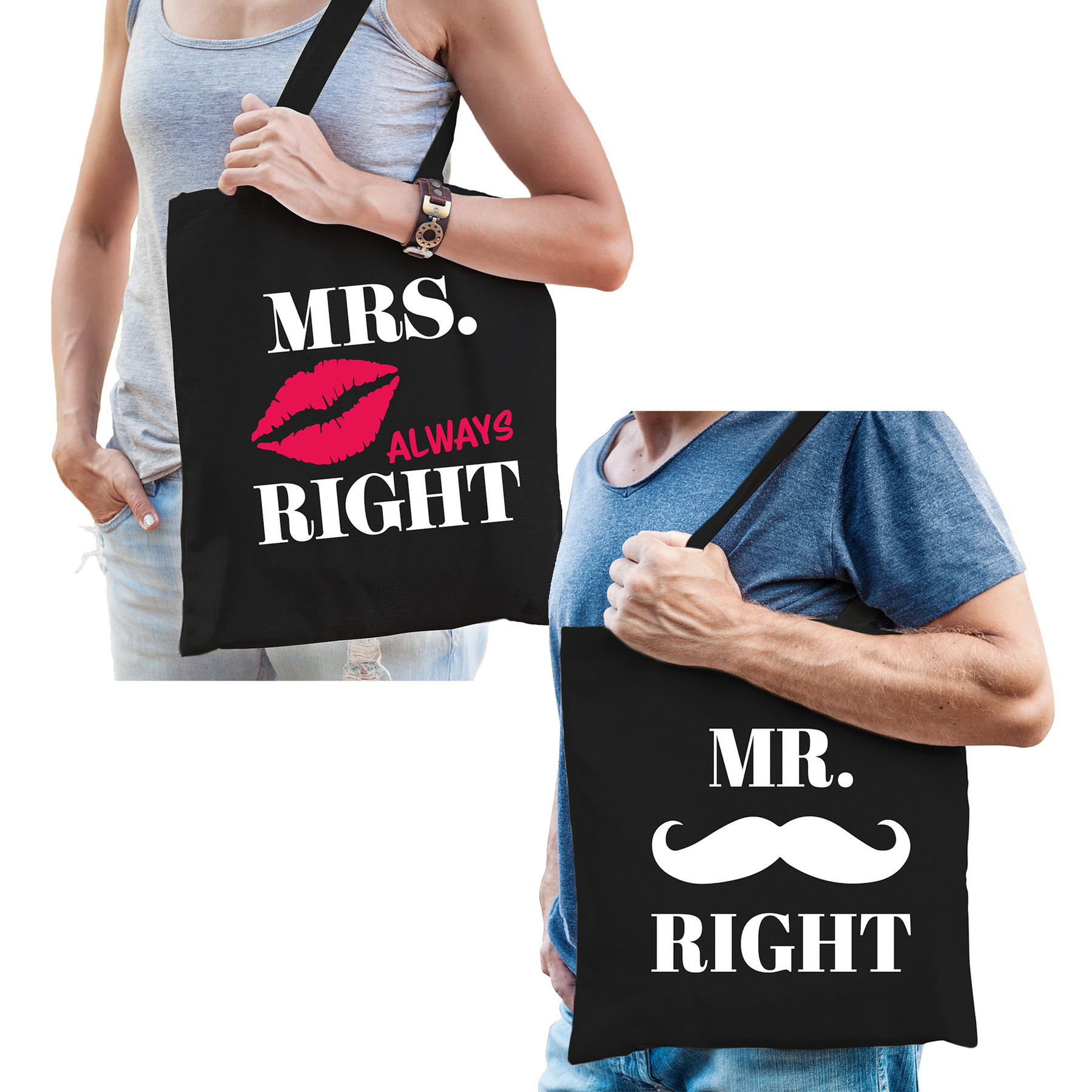 Formaat vak: 42 x 38 cm. Totale lengte inclusief hengsel: 67 cm. Materiaal: 100% katoen, 140 grams kwaliteit. Inhoud: 10 liter. , Dit artikel bestaat uit:, 1x Mr right tasjes met snor heren, 1x Mrs always Right tasje met lippen dames