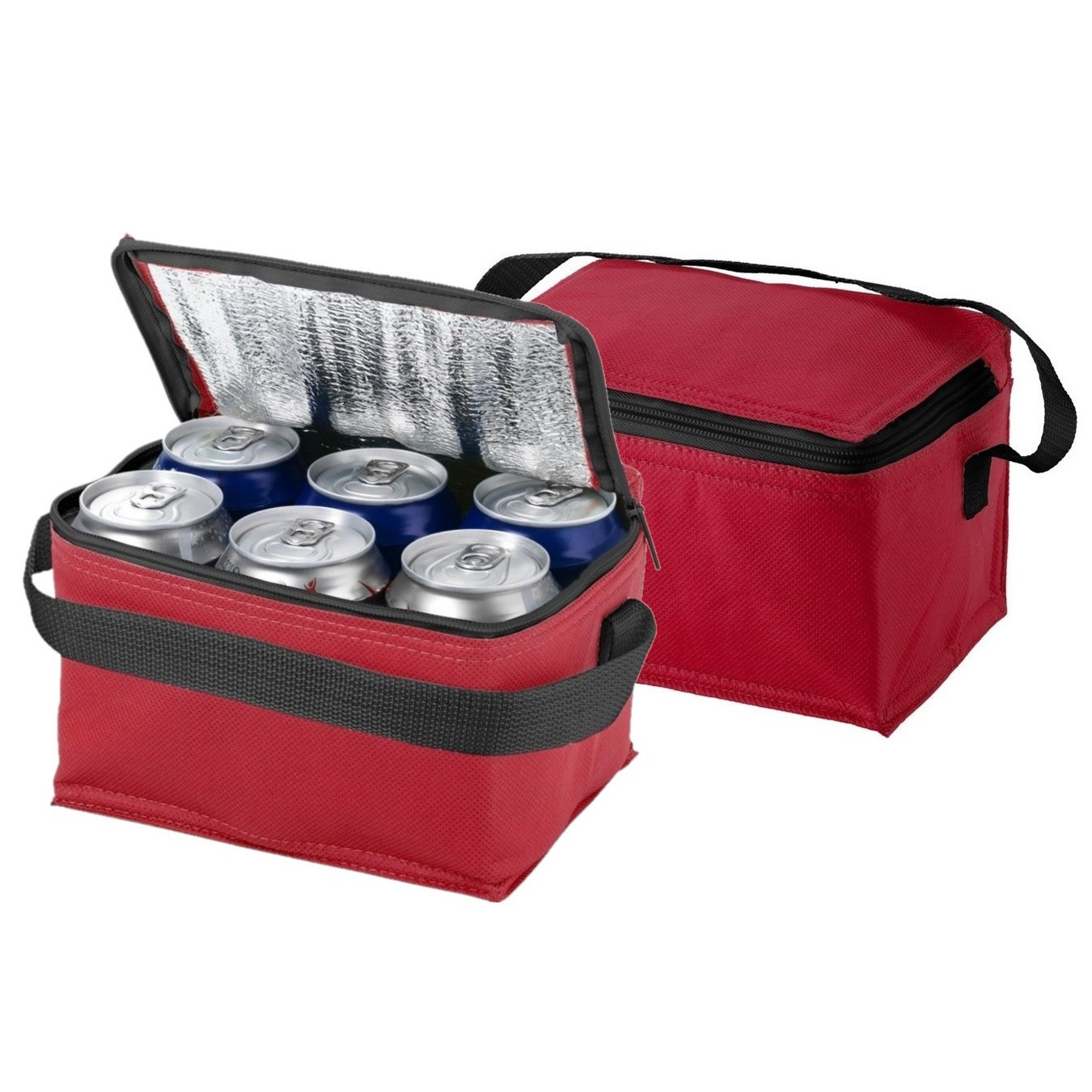 2x mini koeltasje in de kleur rood voor een sixpack blikjes of lunchpakket. Mini koeltas voor het koelen van 6 blikjes of om uw verse lunch in te bewaren. De tas heeft een isolerende laag aan de binnenzijde en is voorzien van een ritssluiting en een korte hengsel in contrasterende kleur. Inhoud: 3,5 liter. Materiaal: 80 g/m2 Polypropyleen. Formaat ongeveer: 20 x 15 x 12 cm. Koeltassen en lunchtrommels. Ook geschikt voor medicijnen.