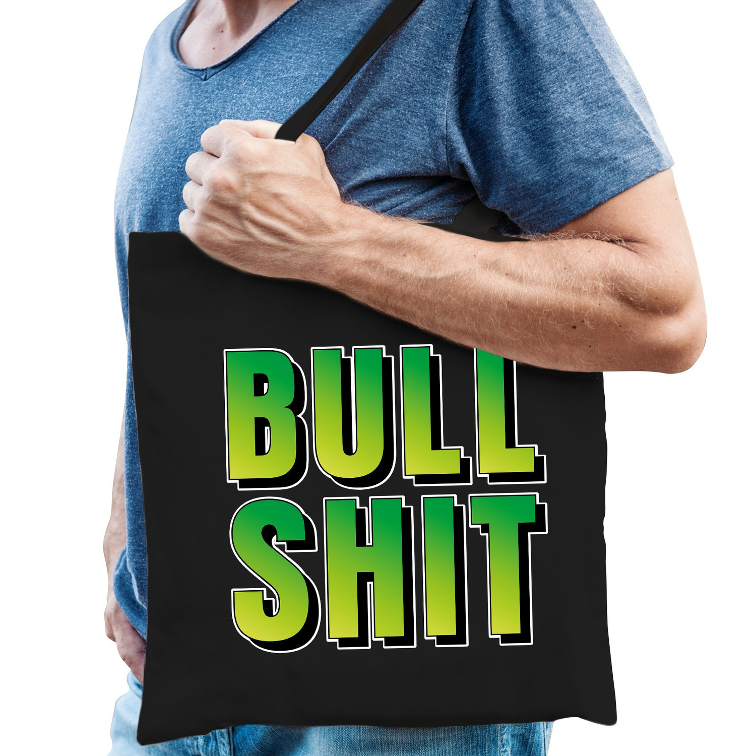 Bullshit fun tekst cadeau tas zwart heren. Dit zwarte katoenen tasje is eenzijdig bedrukt met groen, gele letters met de tekst: Bullshit.