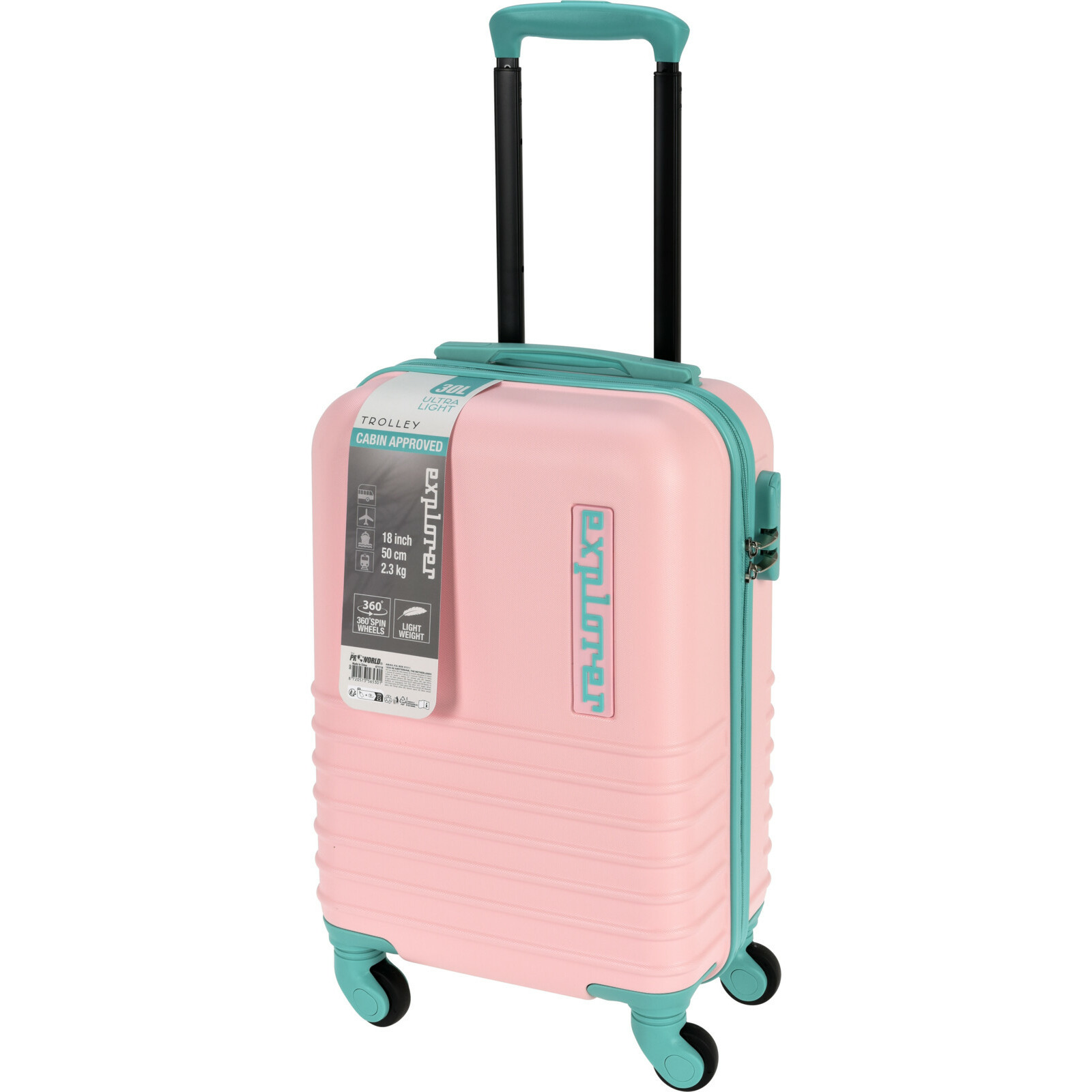 Cabine handbagage reis trolley koffer met zwenkwielen in de kleuren roze/mint. Handige hardcase reiskoffer voor handbagage met afsluitbare rits, handgreep uitschuifbaar tot 100 cm, cijferslot en binnen vakjes. Stevig model, robuust. Afmetingen: 34 x 22 x 52 cm. Geschikt voor de meeste luchtvaartmaatschappijen. Model: Explorer. Materiaal: ABS kunststof. Gewicht: 2.5 kilo. Het oog wil ook wat.