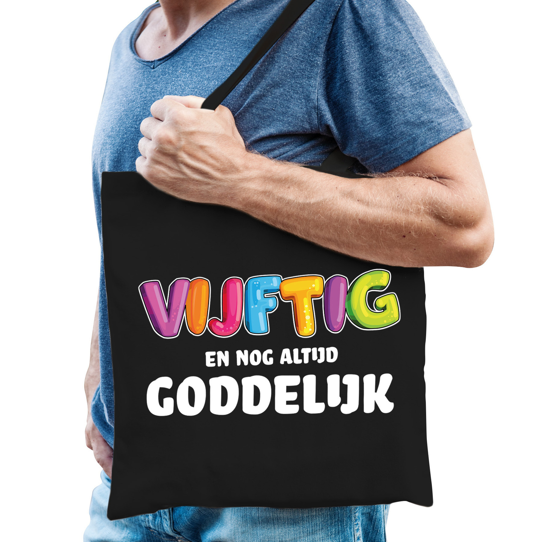 Katoenen cadeau tas/tote bag voor de goddelijke man die 50 jaar wordt. De shopper is in de kleur zwart en is eenzijdig bedrukt met de tekst: Vijftig en nog altijd goddelijk. Het cadeau tasje is leuk om cadeau te geven voor zijn 50e verjaardag (Abraham). Ook leuk om er bijvoorbeeld cadeaus in te doen en die aan de jarige te geven! Materiaal: 100% katoen, 140 grams kwaliteit. Formaat vak: ca. 42 x 38 cm. Totale lengte inclusief hengsel: ca. 67 cm. Inhoud: ca. 10 liter. Merk: Bellatio Decorations.