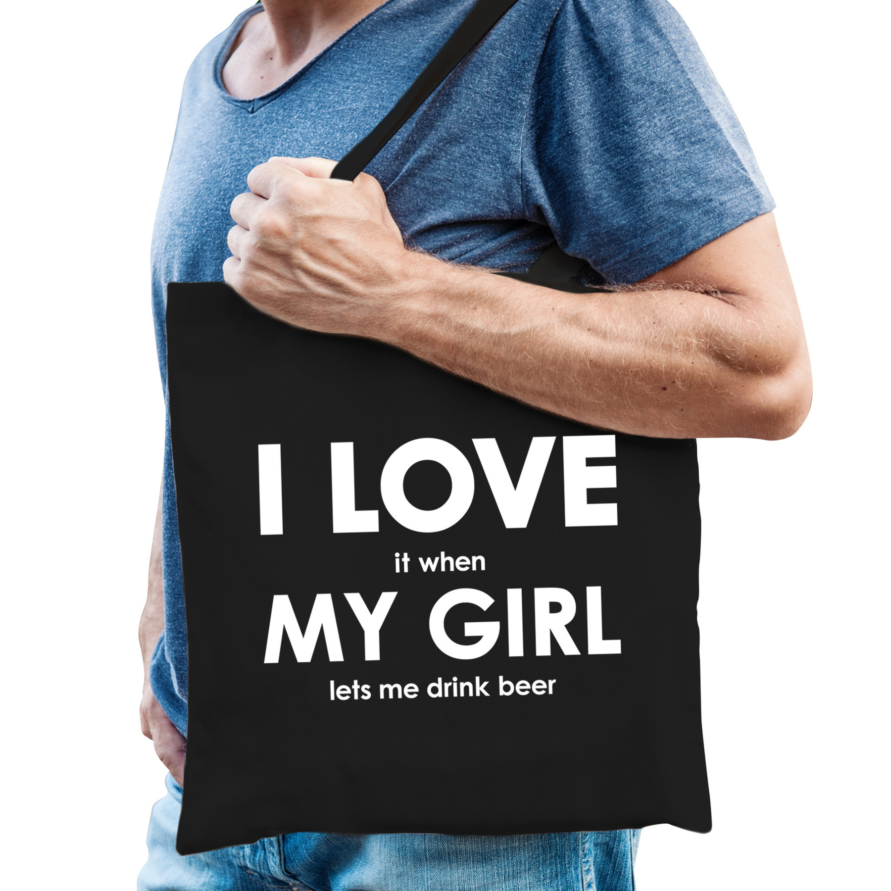 I love it when my girl lets me drink beer cadeau katoenen kado tas / shopper voor heren. Deze tas is eenzijdig bedrukt met de grappige tekst: I LOVE it when MY GIRL lets me drink beer. Grappig cadeau tasje voor een echte bier liefhebber, bijvoorbeeld als origineel cadeau voor je vriend met bier drinken als hobby.