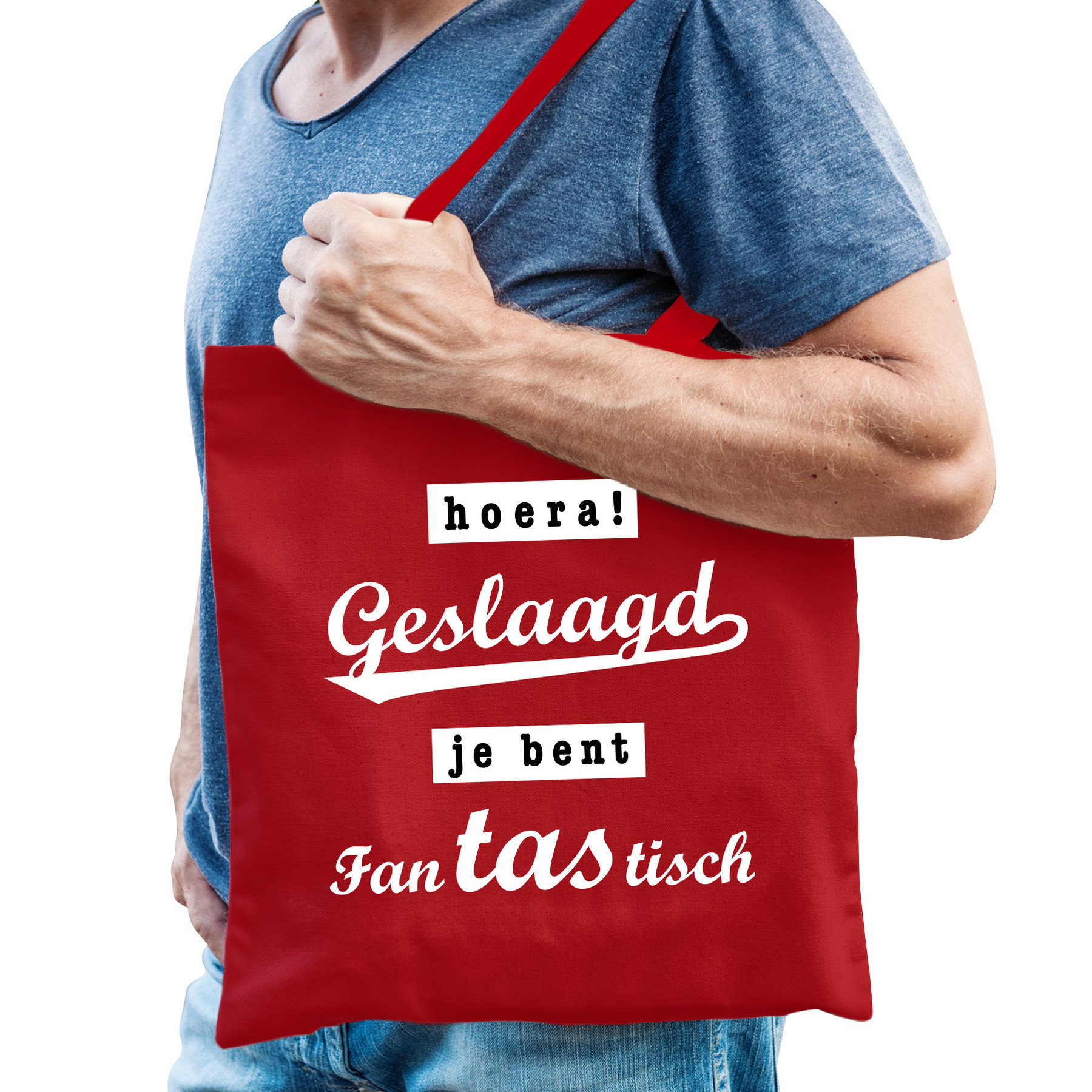 Bellatio Decorations katoenen cadeau tas/shopper/tote bag in de kleur rood. De shopper is eenzijdig bedrukt met de tekst: Hoera! Geslaagd je bent fanTAStisch. Ken jij iemand die net geslaagd of afgestudeerd is? Geef dit leuke tasje dan cadeau! Materiaal: 100% katoen, 140 grams kwaliteit. Formaat vak: ca. 42 x 38 cm. Totale lengte inclusief hengsel: ca. 67 cm. Inhoud: ca. 10 liter.