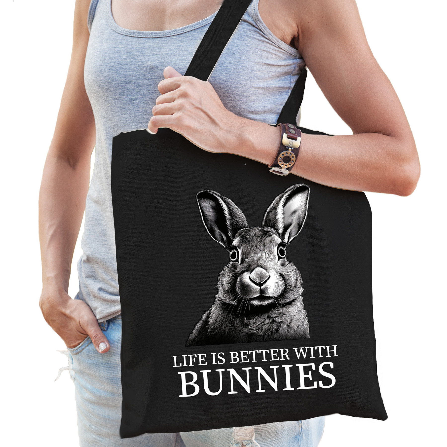 Op zoek naar een origineel cadeau voor een konijnenfan of boerderijdierenliefhebber? Deze zwarte katoenen tas met vrolijke konijnenprint is een schot in de roos! Perfect om een presentje in te verpakken, maar stiekem z? leuk dat je ?m liever zelf houdt. De tas is herbruikbaar, licht ?n handig voor een snelle boodschap, een dagje uit of gewoon als vrolijke eyecatcher. Een handige tote bag voor allerlei spullen. Materiaal: 100% katoen, 140 grams kwaliteit. Formaat vak: ca. 42 x 38 cm. Totale lengte inclusief hengsel: ca. 67 cm. Inhoud: ca. 10 liter. Merk: Bellatio Decorations.