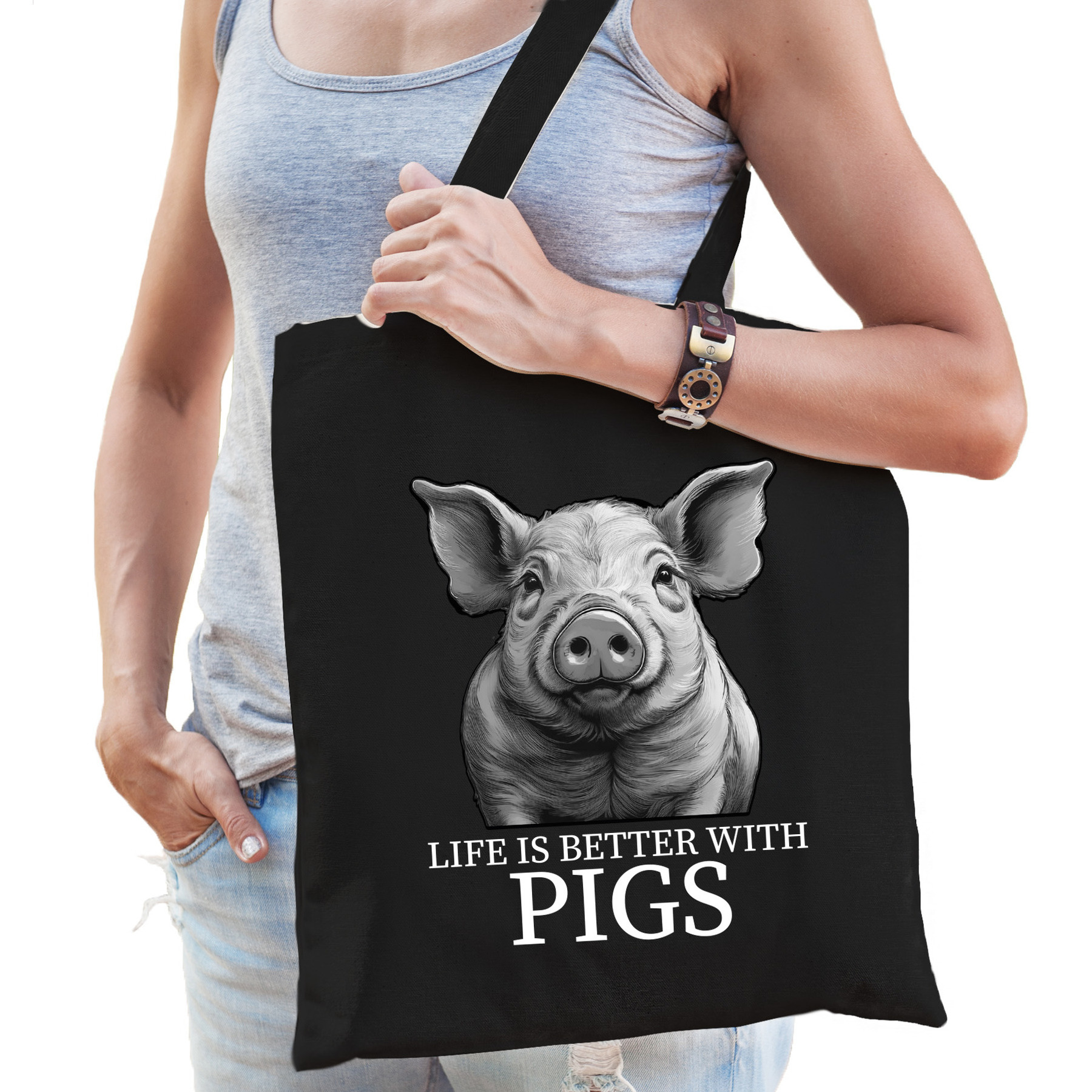 Op zoek naar een origineel cadeau voor een varkenfan of boerderijdierenliefhebber? Deze zwarte katoenen tas met vrolijke varkenprint is een schot in de roos! Perfect om een presentje in te verpakken, maar stiekem z? leuk dat je ?m liever zelf houdt. De tas is herbruikbaar, licht ?n handig voor een snelle boodschap, een dagje uit of gewoon als vrolijke eyecatcher. Een handige tote bag voor allerlei spullen. Materiaal: 100% katoen, 140 grams kwaliteit. Formaat vak: ca. 42 x 38 cm. Totale lengte inclusief hengsel: ca. 67 cm. Inhoud: ca. 10 liter. Merk: Bellatio Decorations.